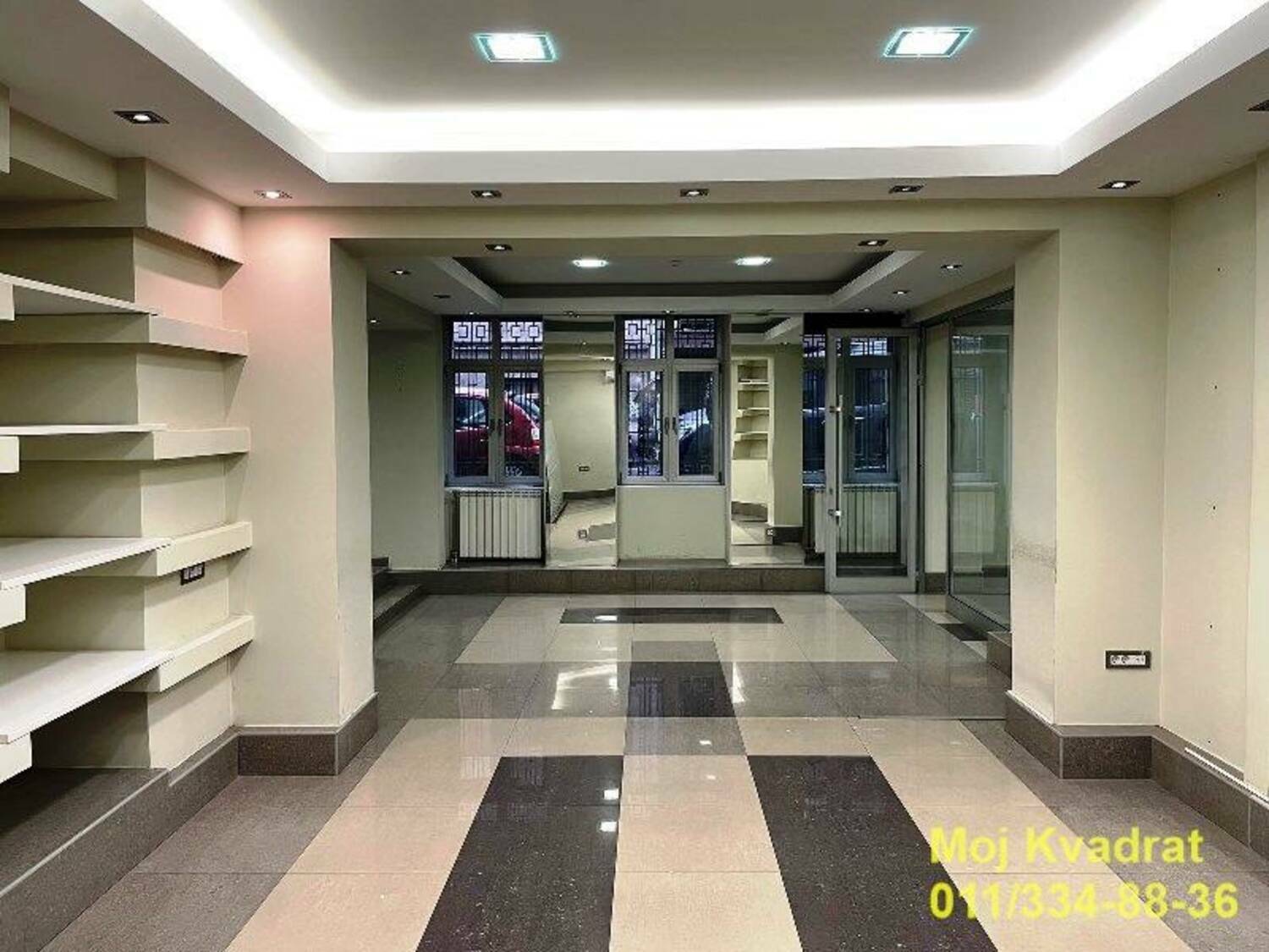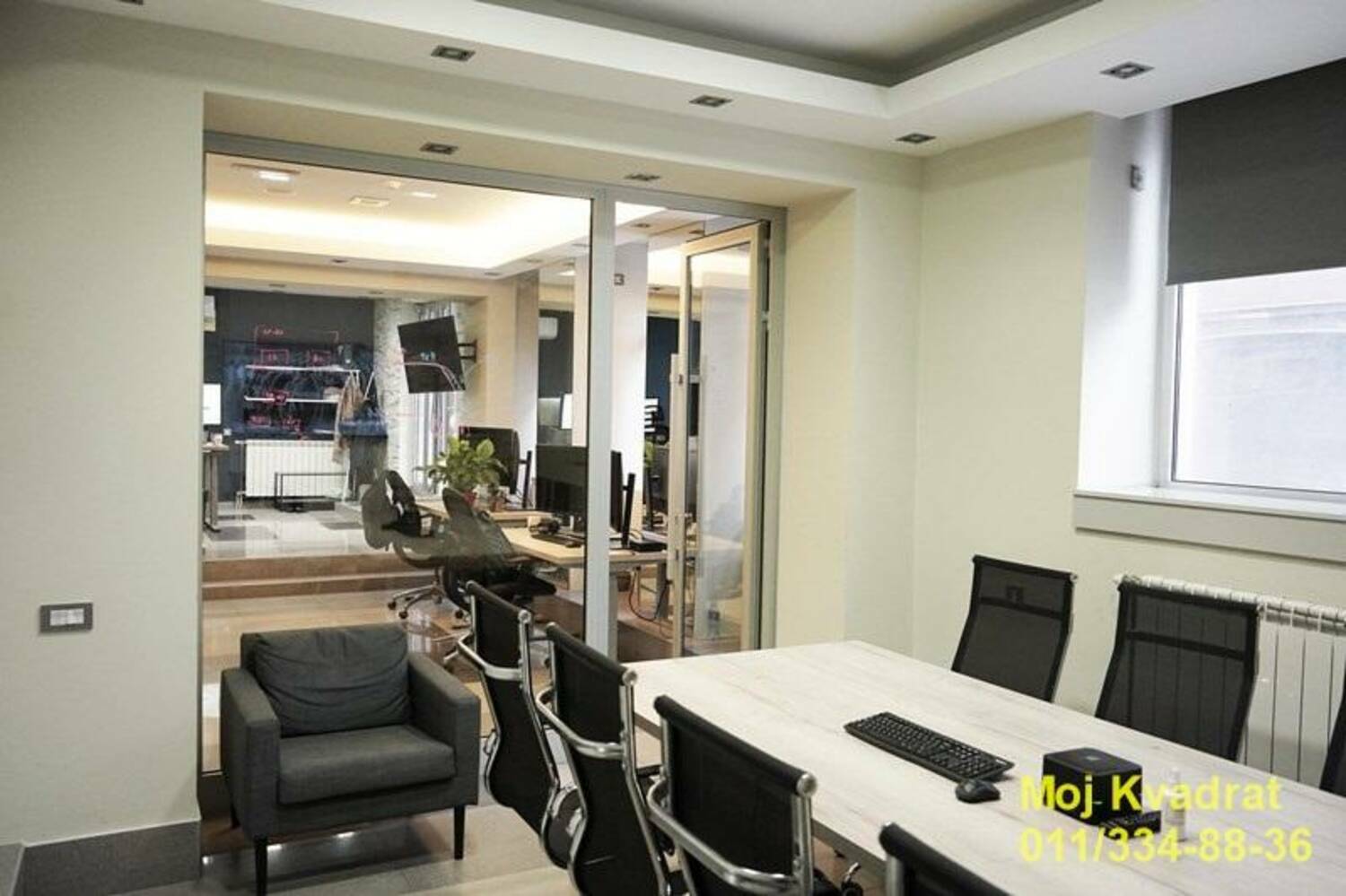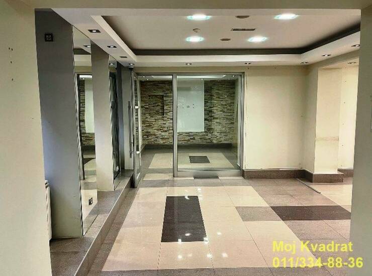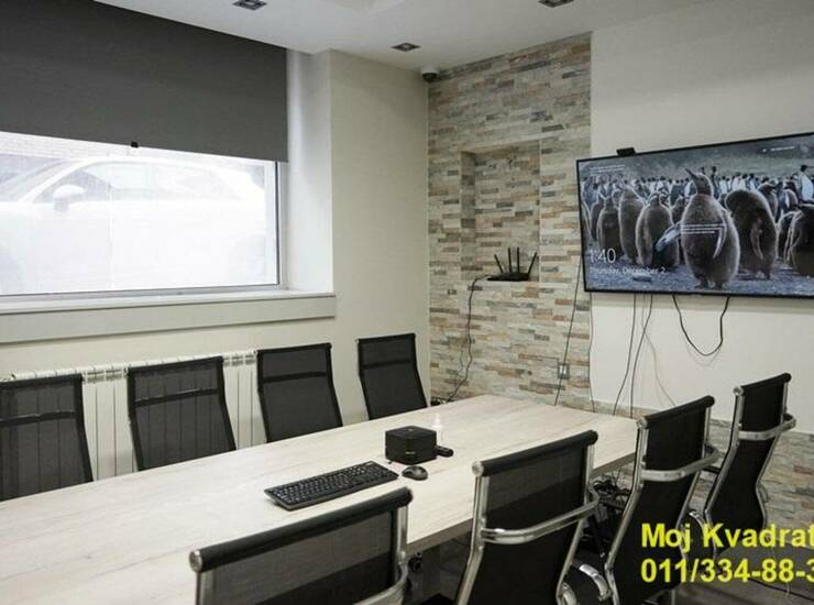 Ima veliku konferencijsku salu, dve zasebne prostorije, dva mokra čvora, magacin. Izlog ka ulici.