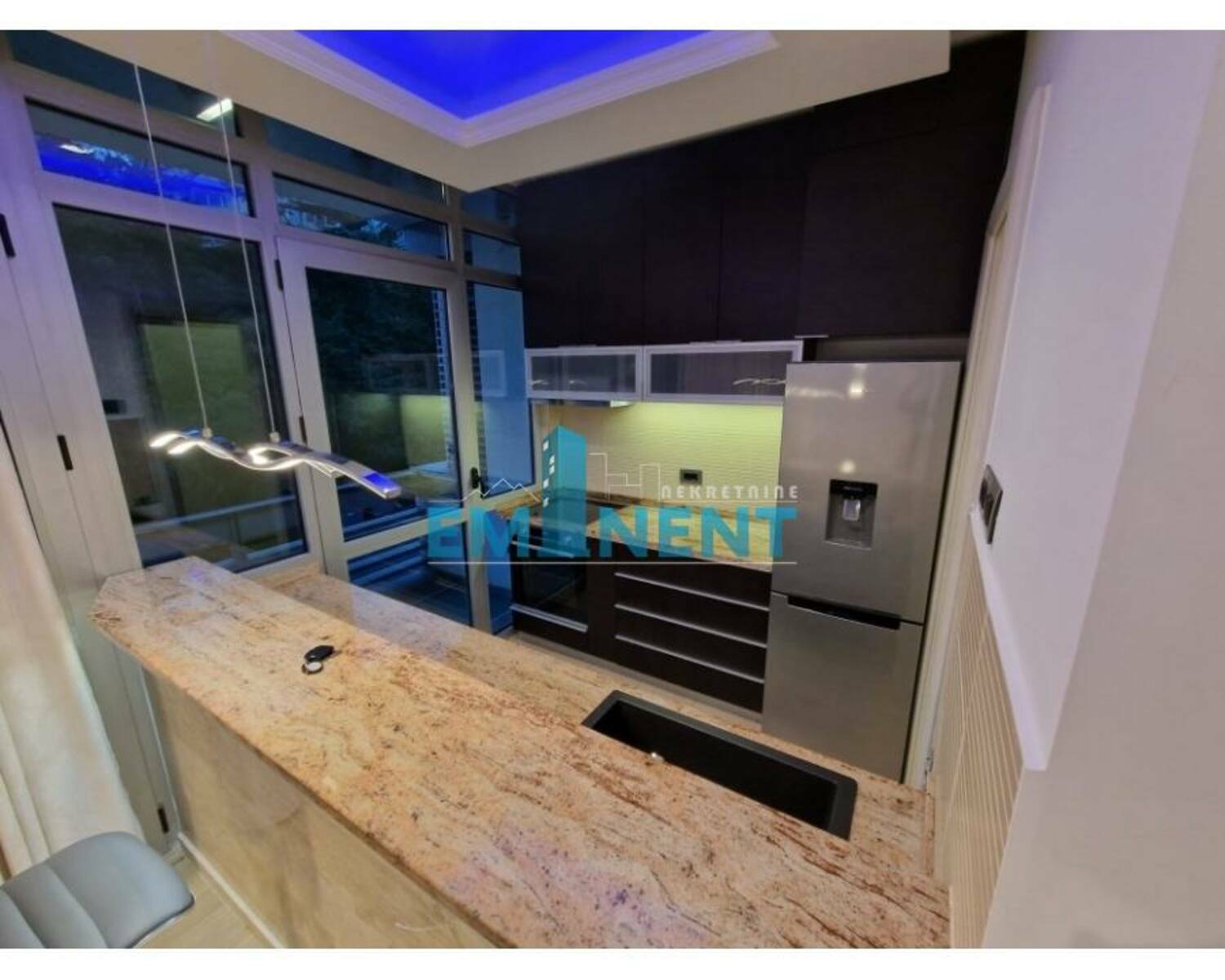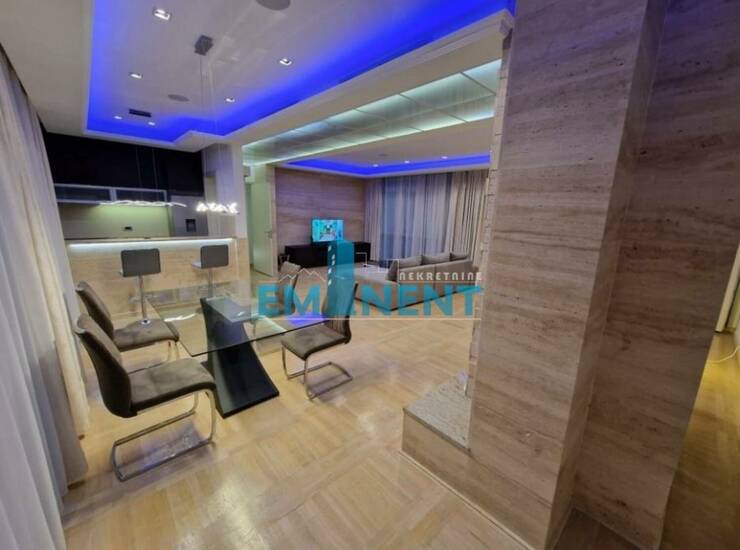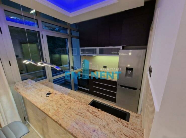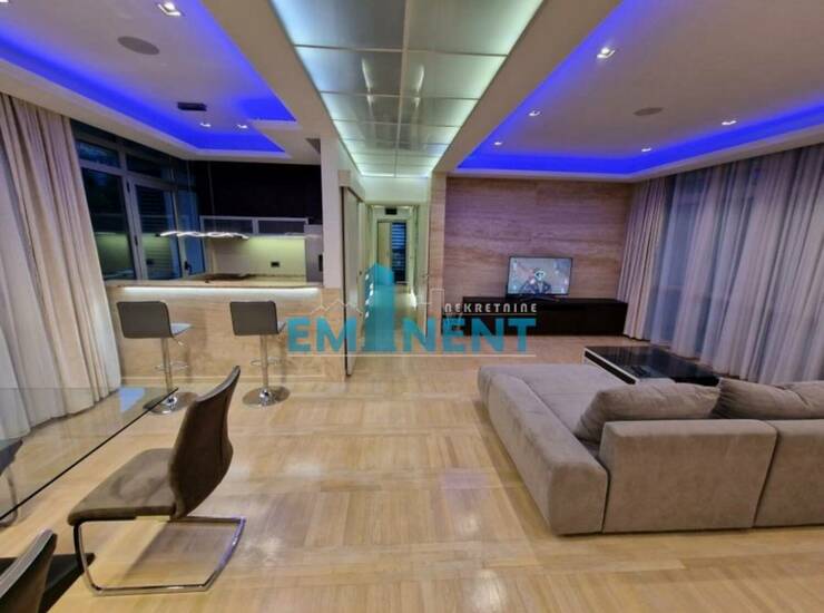 Extra lux namešten, veoma komforan, dve spavaće sobe, dva kupatla, komforan, alarmni i požarni sistem, kamin sa automatskim duvanjem, ceo stan je pod led rasvetom sa daljinskim upravljanjem, klimatizovan sa dva sistema, prvoklasna italijanska keramika i đakuzi kade, u kuhinji je granit, zgrada sa bazenom, u cenu uračunata dva garažna mesta, kao i pripadajuće parking mesto, ostava, domar, izuzetan. Održavanje kompleksa je uračunato u cenu.
