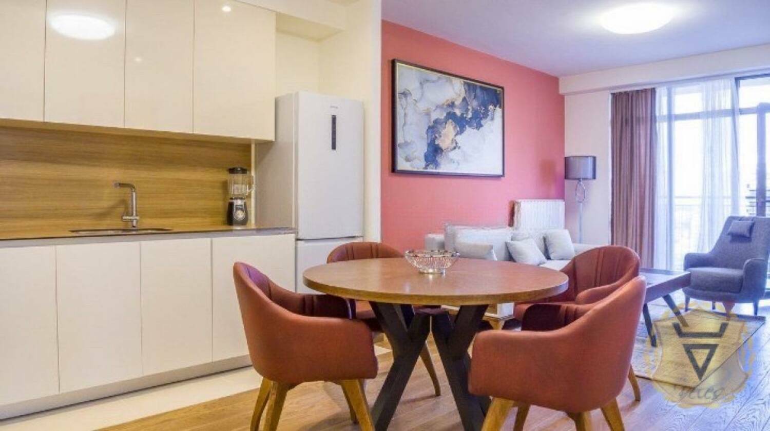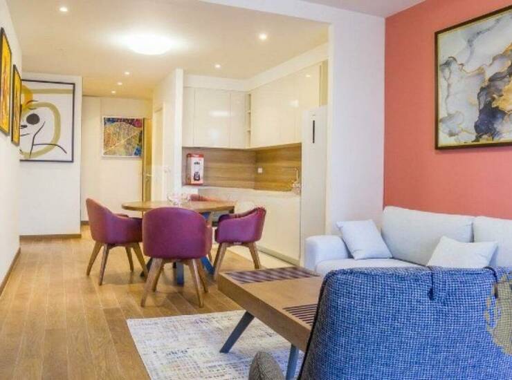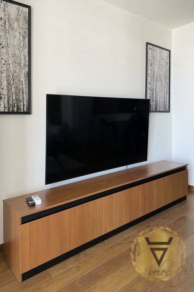 Stan je kompletno opremljen svim neophodnim nameštajem i kuhinjskim aparatima. Stan je funkcionalnog rasporeda sa otvorenim konceptom dnevnog boravka i kuhinje, dok su spavaće sobe i kupatila diskretno odvojena.