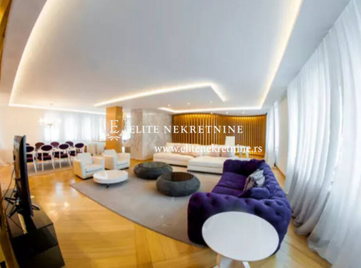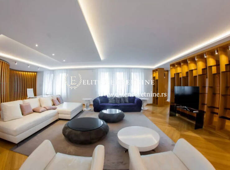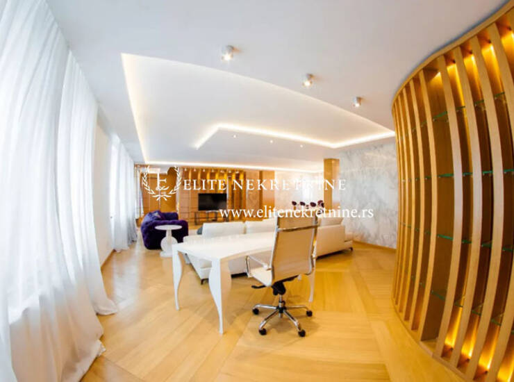 Ovaj luksuzan stan je smešten na poslednjem spratu zgrade novije gradnje i prostire se na dva nivoa. Smeštena u tihoj i mirnoj ulici, između Kalenić pijace i Bulevara kralja Aleksandra. Vrlo živopisan kraj koji obiluje kafeima, restoranima, manjim prodavnicama različitog sadržaja. Lako se stiže do svih delova grada kako kolima, tako i javnim prevozom. Izuzetan ambijent koji odiše atmosferom prestonice i pruža stanaru moderan i udoban stil življenja. U suterenu zgrade se nalazi ogroman garažni prostor koji je, kao i cela zgrada pod video nadzorom . Stan je atipičnog izgleda. Donji nivo stana se sastoji iz jedne celine koja obuhvata dnevni boravak, trpezariju, kuhinju i radni deo. Na ovom nivou je i kupatilo i jedna spavaća soba predviđena za goste. Na spratu su dve ogromne spavaće sobe, svaka sa sopstvenim kupatilom i garderoberom. Terasa je na gornjem nivou, okrenuta ka ulici, i pruža pogled na krovove Vračara. Enterijer stana je jednostavan, sa elementima luksuza, uređen da zadovoljava potrebe zahtevnih stanara. Izuzetan dizajn oplemenjen različitim detaljima u vidu dekorativnih tapeta, detalja od gipsa, drveta, odlične rasvete sve do maslinovog drveta kao dekoracije. Nameštaj je vrhunskog kvaliteta i odlično uklopljen u čitav ambijent.