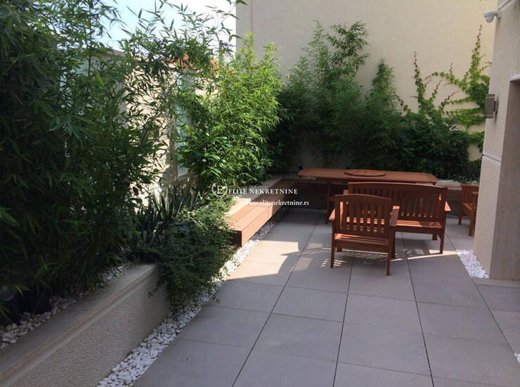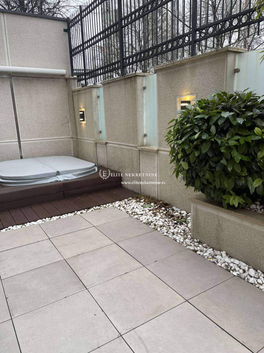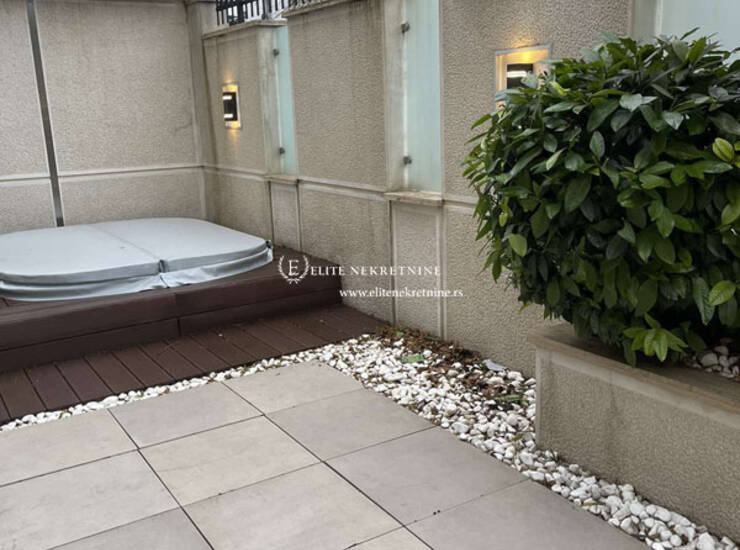 Iz dnevnog boravka se izlazi na jedinstvenu terasu, transformisanu u privatno dvorište – pravu oazu mira u urbanom okruženju. Ovaj ekskluzivni spoljašnji prostor opremljen je đakuzijem i luksuznim setom za roštilj, idealnim za uživanje, relaksaciju i prijeme u intimnoj atmosferi.