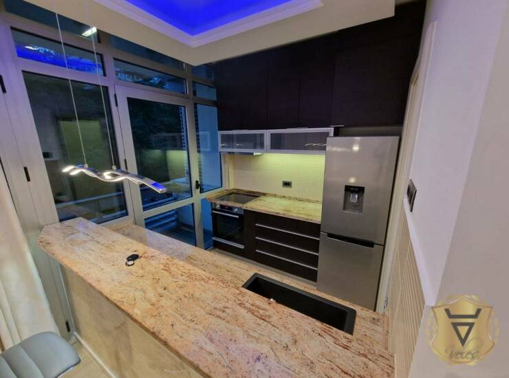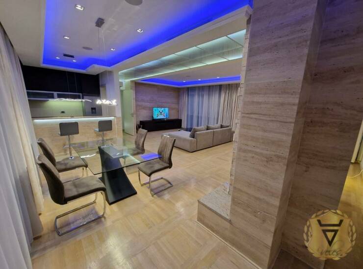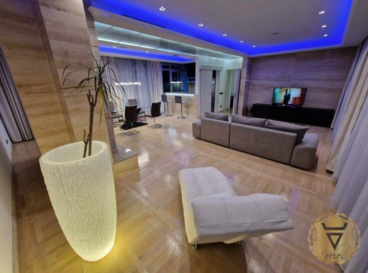 Klimatizovan sa dva sistema-svaka soba poseduje dva sistema, ceo stan je u led tehnoligiji sa daljinskim komandama za svaku sobu( svaka soba menja boje) prvoklasnom italijanskim kupatilima sa djakuzi kadom (porcelanosa) keramika, huhinja je u granitu sa sankom i kaminom, uz stan idu 2 garažna mesta kao i pripadajuće parking mesto.
