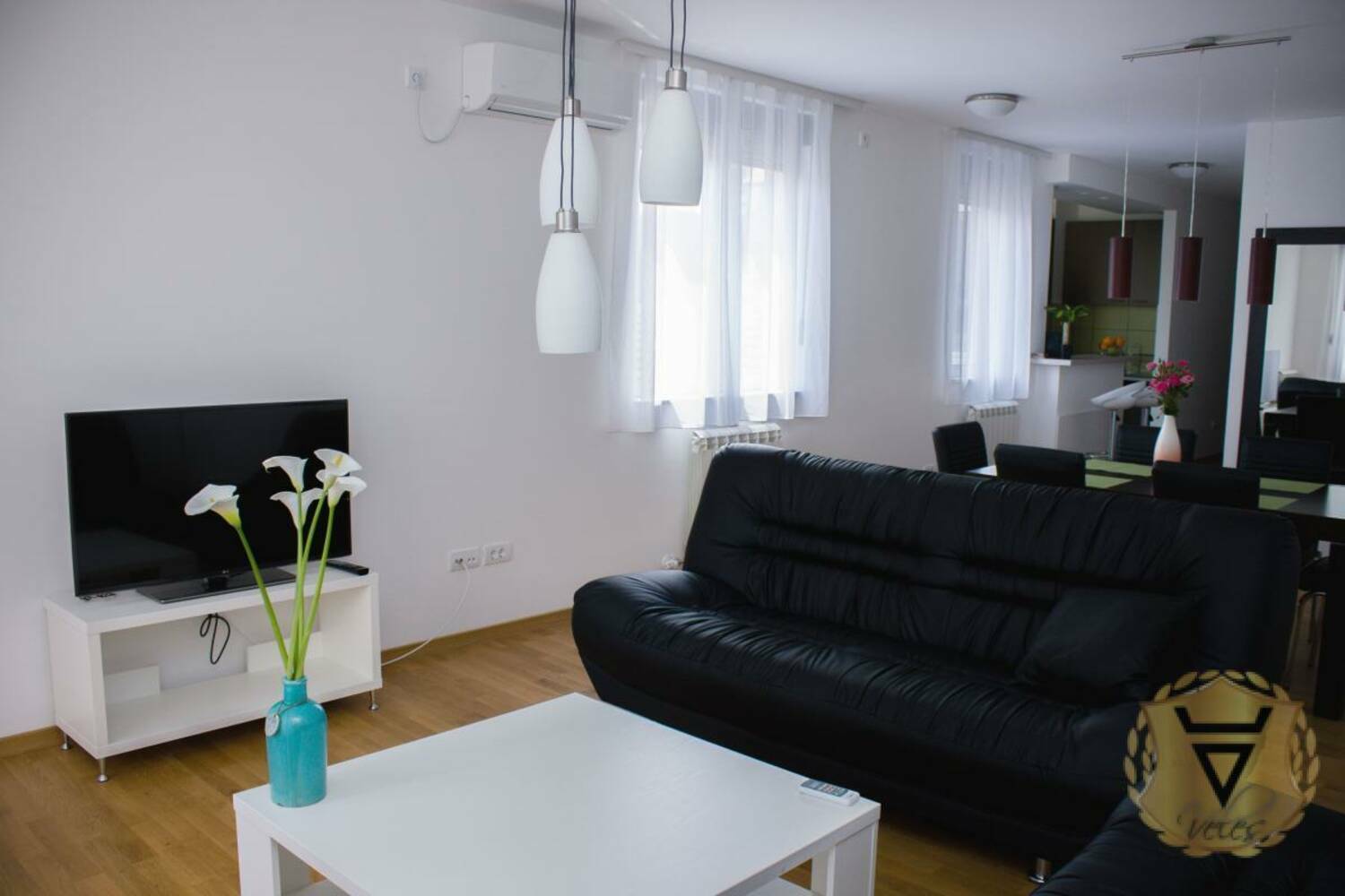 Grejanje je daljinsko, obračun cene prema merenju kalorimetra. Topla voda u kupatilu neograničena, dobija se preko protočnog bojlera. Izdaje se kompletno namešten, kao na slikama.