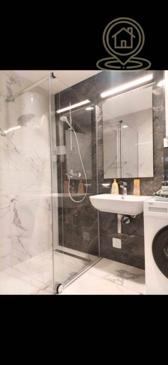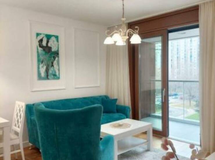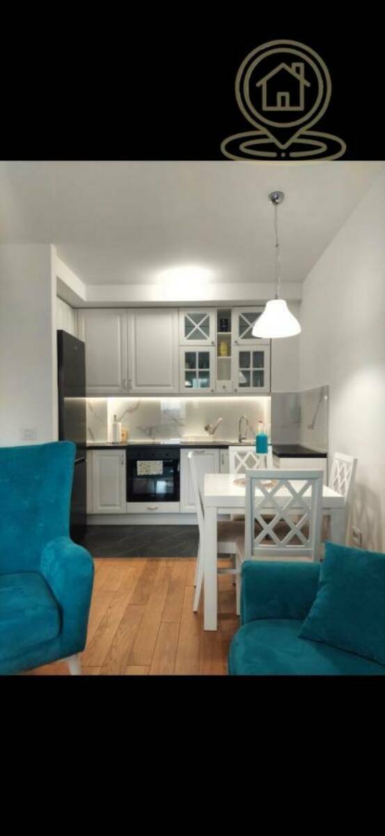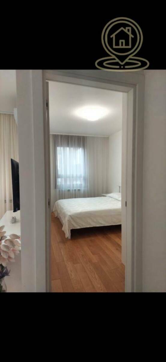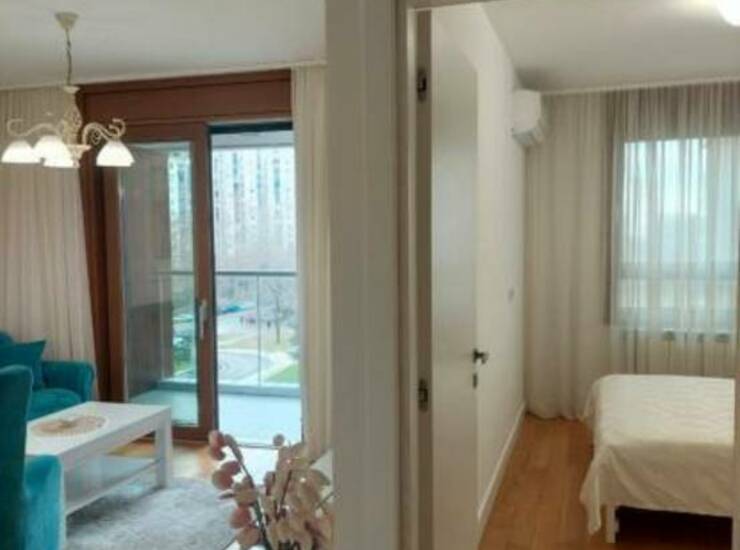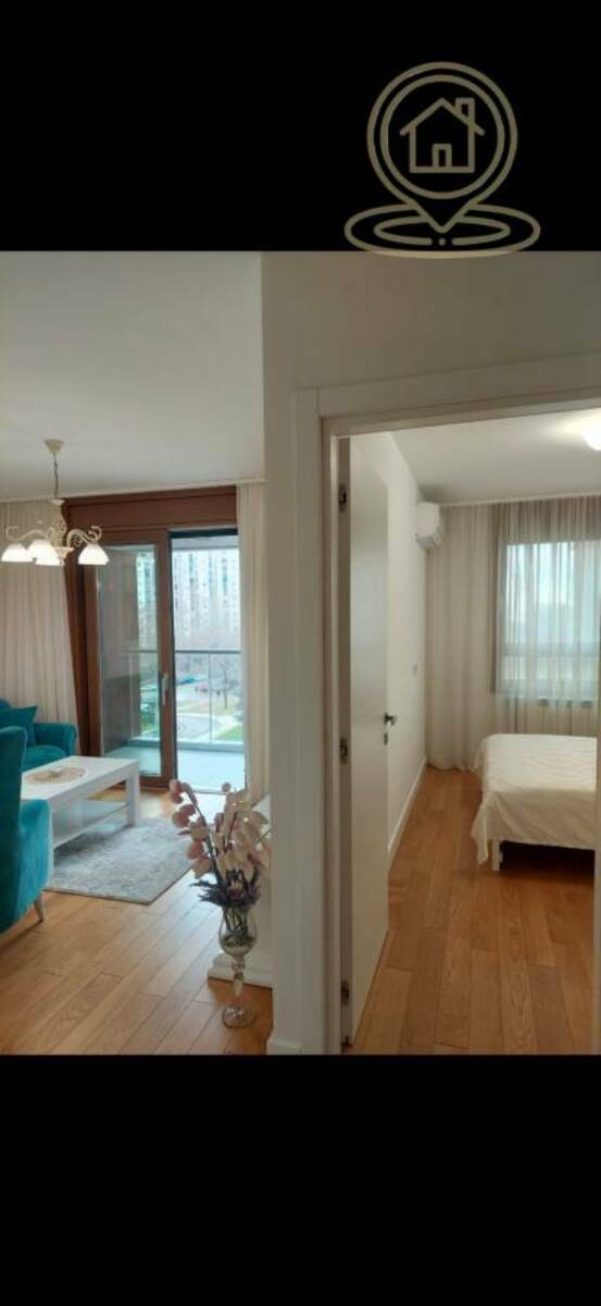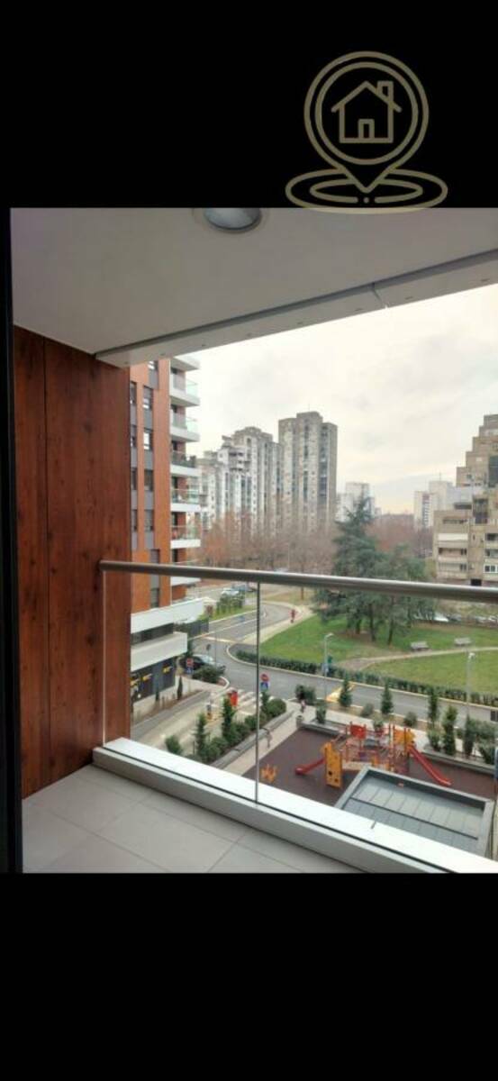 (Blok 63, Novi Beograd). Odlikuje se modernim dizajnom, poseduje jednu spavacu sobu,dnevi prostor, prostrano opremljeno kupatilo,prostranu terasu, CG po utrošku, kablovska.Idealno za udoban život na atraktivnoj lokaciji. Sa sopstvenim dvorištem uređenim, fontanom, kao i dečijim igralištem. Stan je kompletno lux namešten