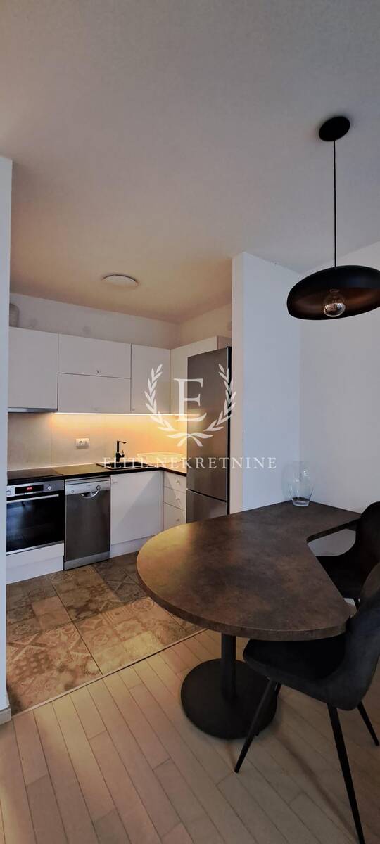 Enterijer je savremeno osmišljen. Dnevni boravak je svetao i prijatan, sa izlazom na terasu koja pruža dodatni prostor za odmor i uživanje. Kuhinja i trpezarija čine skladnu celinu, dok je stan projektovan tako da maksimalno iskoristi prostor i prirodnu svetlost.