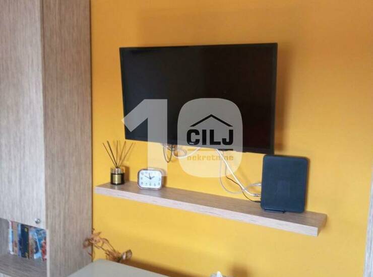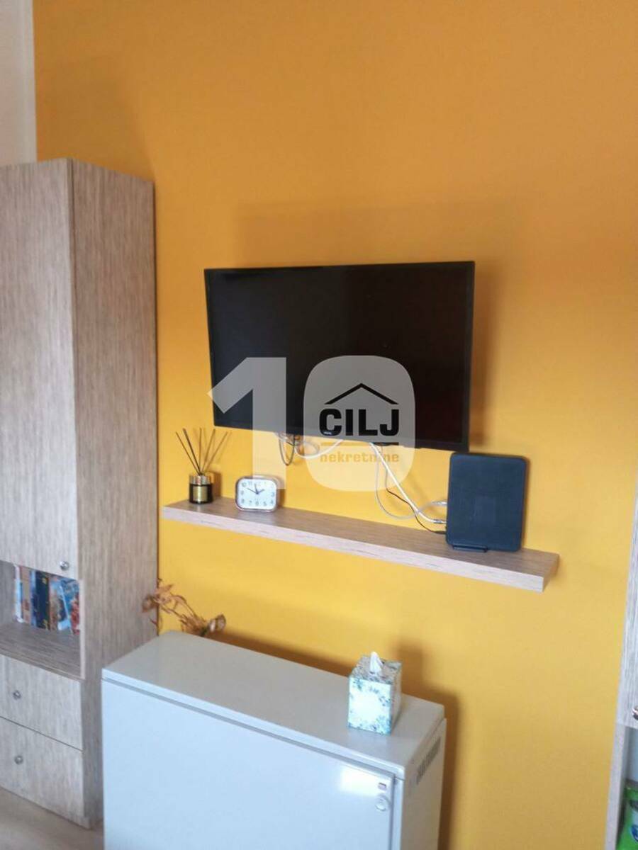 Garsonjera adaptitana u 1,5 stan, sastoji se iz: pretsoblja, kuhinje, dnevnog boravka, spavaće sobe i kupatila. Svaka prostorija ima prozor sa lepim pogledom na veći deo Beograda, a posebno na Beograd na vodi.