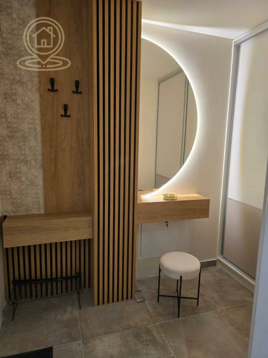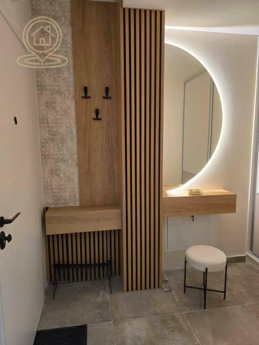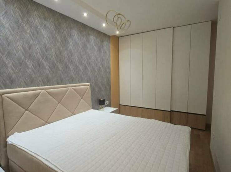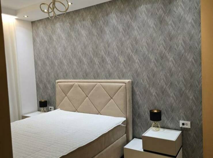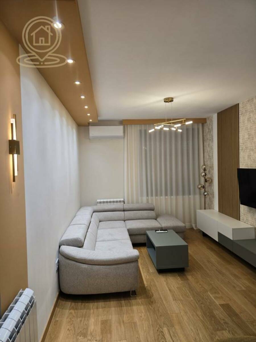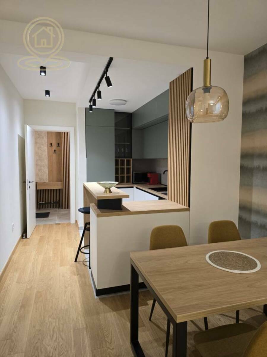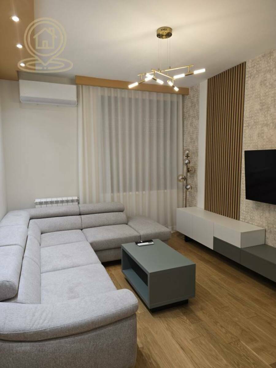 Stan je vrhunski opremljen, sa nameštajem rađenim po meri i pažljivo biranim detaljima najvišeg kvaliteta. Udoban krevet, luksuzna ambijentalna rasveta i veliki TV pružaju maksimalan komfor i moderan stil života. Prostor odiše elegancijom i funkcionalnošću.