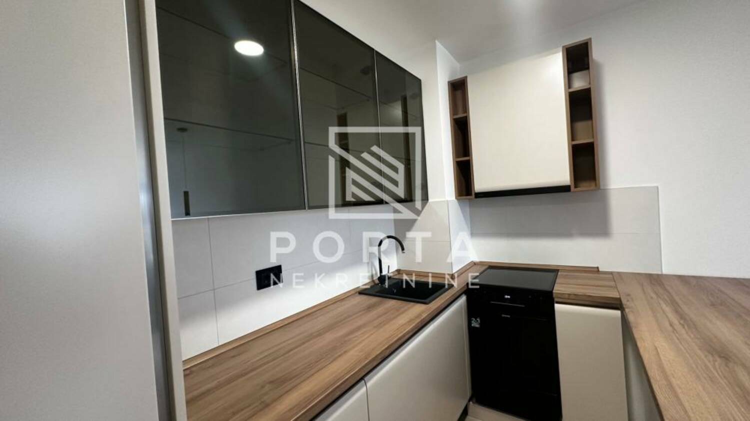 Dizajnerska kuhinja sa ugradnim aparatima (frižider, mašina za sudove, ploča za kuvanje, ostava)