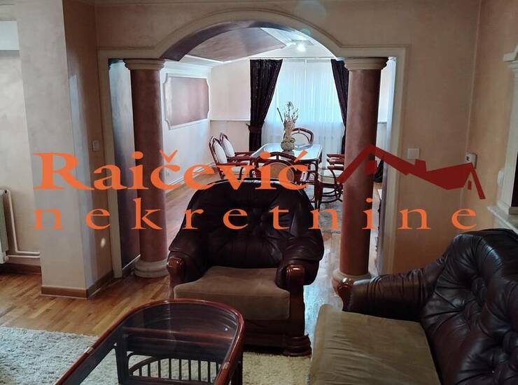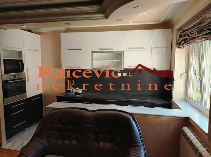 Luksuzno opremljen 4.0 stan sa dnevnim boravkom sa kuhinjom, trpezarijom, tri spavace sobe i kupatilom.