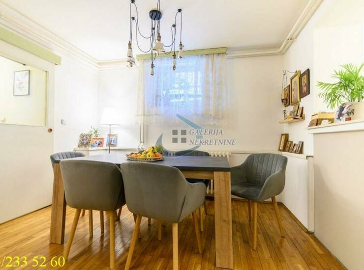 U prilici smo da Vam ponudimo u zakup komforan petosobni dupleks koji se nalazi na visokom prizemlju i suterenu održavane i odlično očuvane dvospratnice bez lifta, kvalitetno zidane 1969 godina prošlog veka. Zgrada je mala, sa svega osam stanova i lepim zajedničkim dvorištem. Gornji nivo (mereno 56m2), na visokom prizemlju je organizovan kao spavaći deo, a donji (mereno 51m2) kao dnevni deo. Sve prostorije su komotne, funkcionalno raspoređene i sve imaju prozore. Trostrana orijentacija pruža dovoljno dnevnog svetla. Dnevni boravak, smešten na donjem nivou, deli prostor sa trpezarijskim delom, a kuhinja je odvojena. Ima dve terase, od kojih je veća zastakljena. Stan je u odličnom stanju i izdaje se namešten i opremljen. Grejanje je centralno. Veliki doprinos komforu je zajedničko dvorište iza kuće koje je kao stvoreno za uživanje, za odrasle i decu, kao i mesto za parkiranje dva a