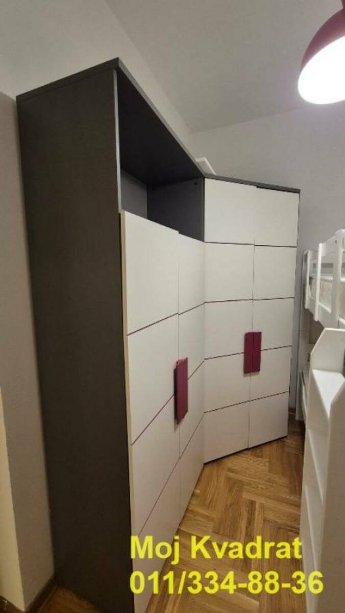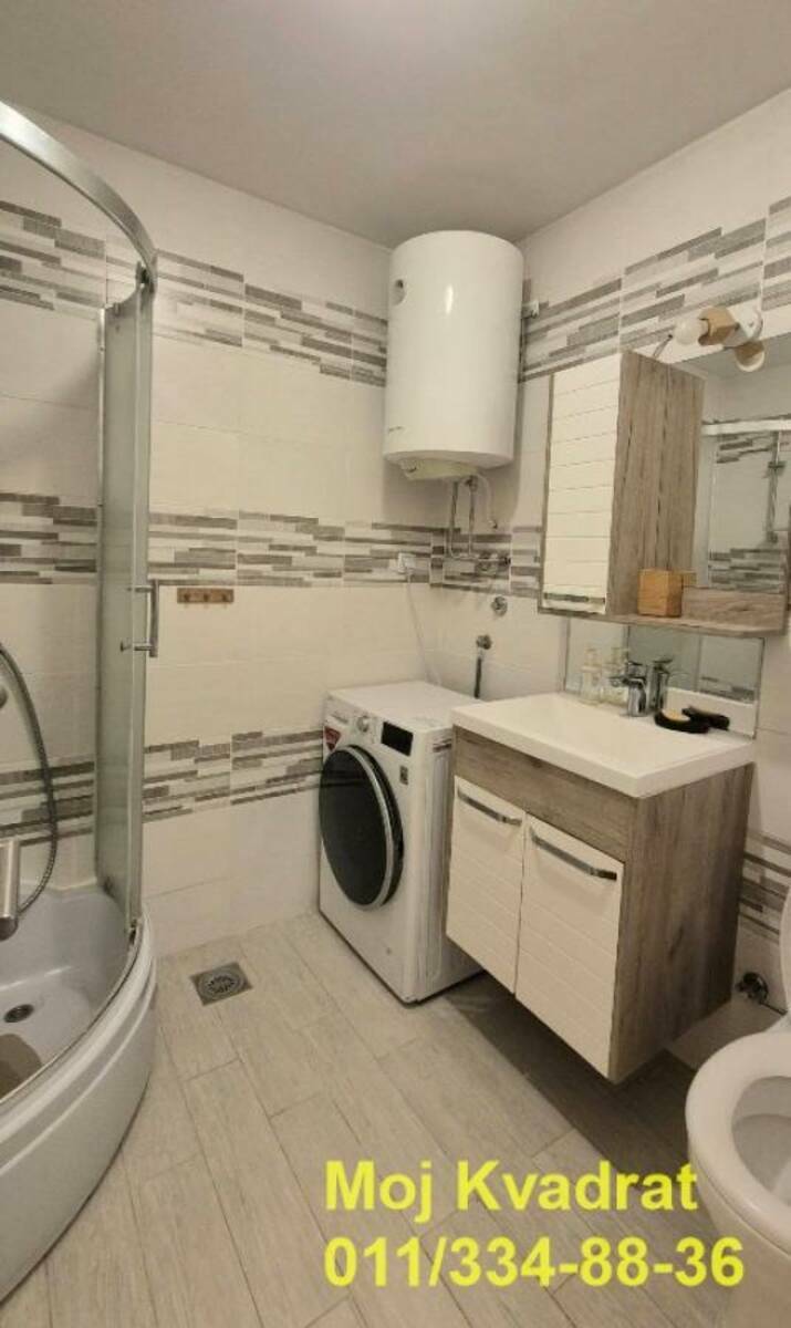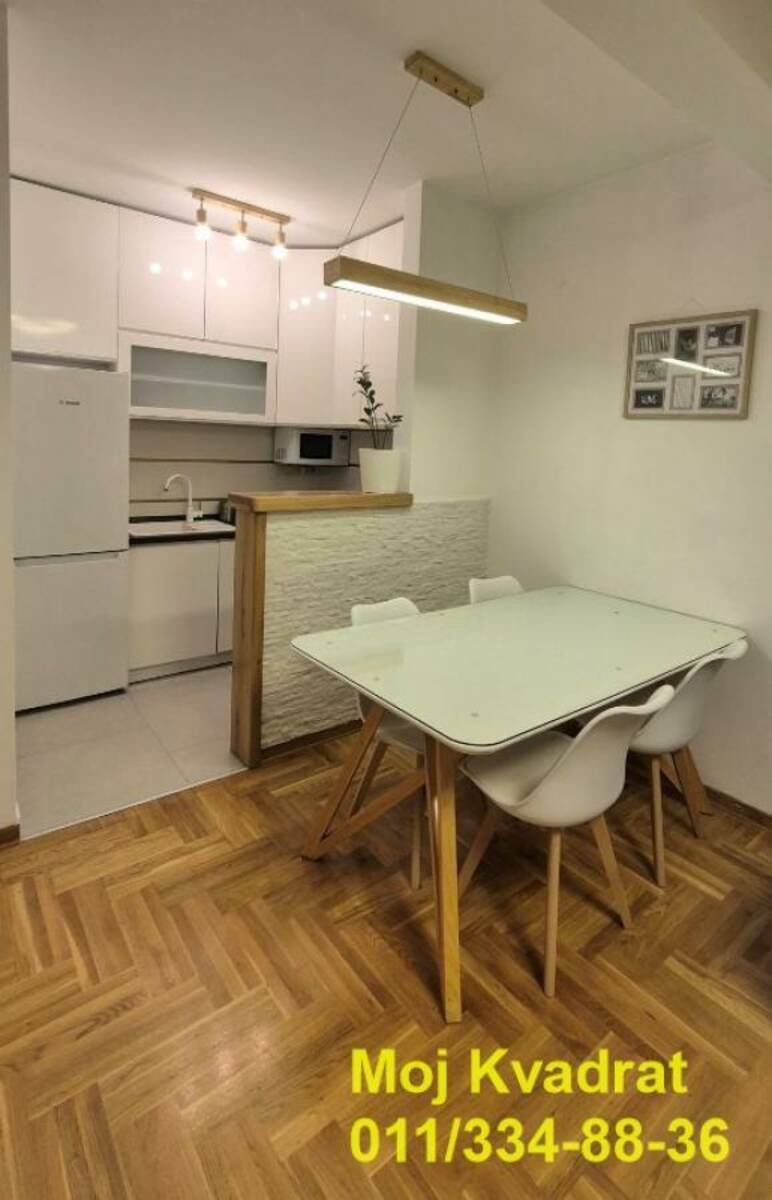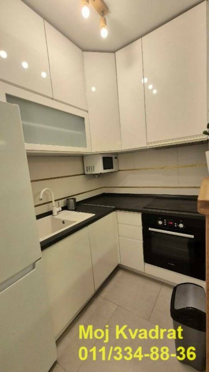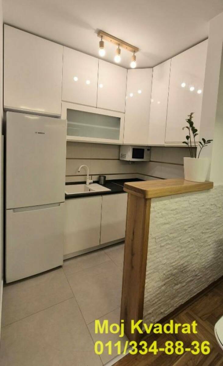 Izdaje se namešten kao na slikama, a opremljen je BOSCH tehnikom - frižider, ugradna rerna, ploča, mašina za sudove, mikrotalasna, TV, veš mašina (LG mašina za pranje i sušenje). Za manju sobu se može po želji dodati krevet ili radni sto.