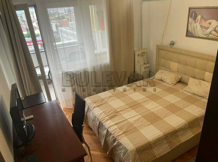 Izdaje se dvoiposoban stan površine 76m2 na dvanaestom spratu u zgradi sa liftom u blizini Doma zdravlja. Sastoji se od ulaznog hodnika, trpezarije sa kuhinjom, dnevne sobe, dve spavaće sobe, kupatila, toaleta i dve terase. Grejanje je centralno. Ima klimu. Komplet je opremljen nameštajem i svom potrebnom belom tehnikom. Lepo je osvetljen i orijentisan. Izdaje se ozbiljnim zakupcima na duži vremenski period. Obavezan depozit u visini jedne mesečne kirije.