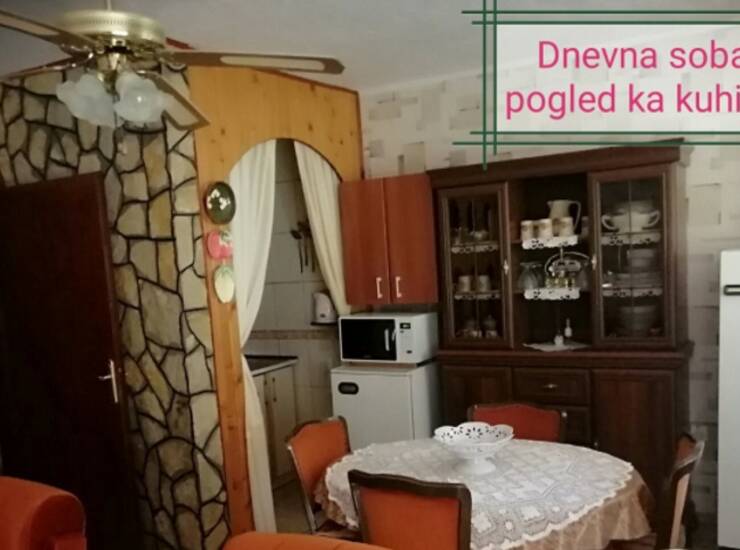 U prizemlju ima najpre prostrana veranda iz koje se ulazi u dnevnu sobu sa trpezarijom,zatim mala kuhinjica i kupatilo.