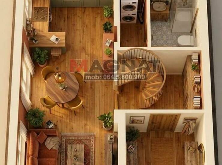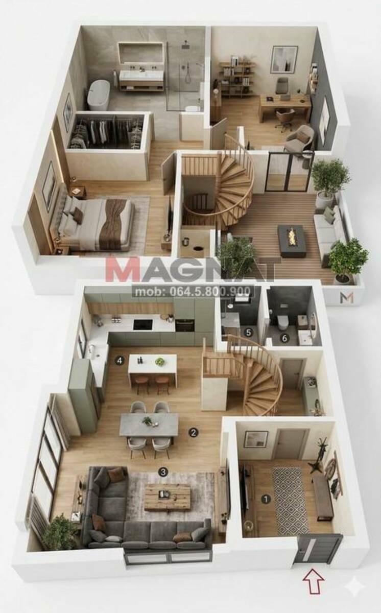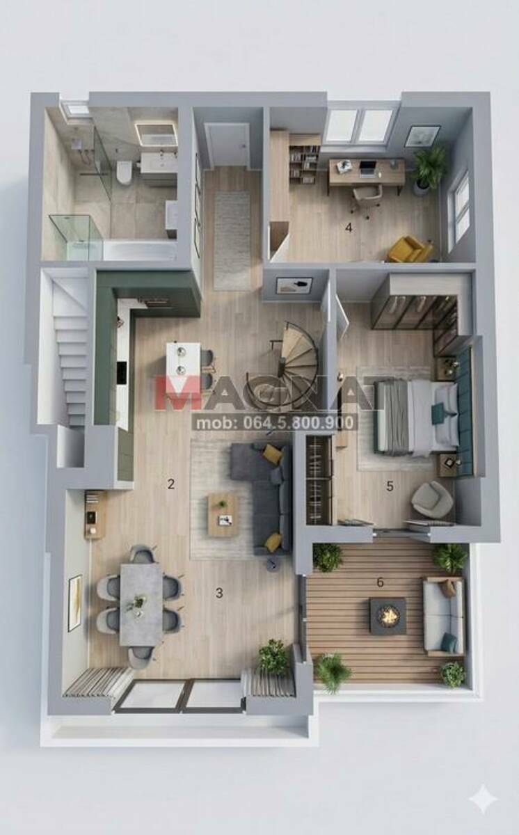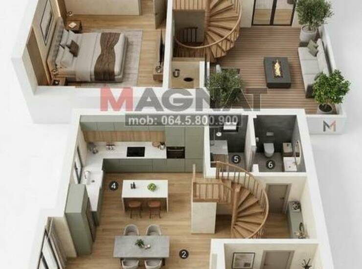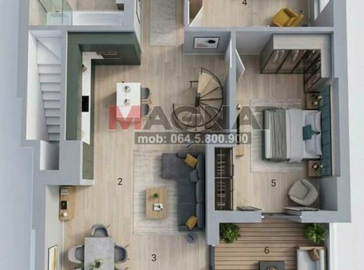 Prizemlje: malo dvorište, ulazni deo sa metalnim kružnim stepeništem, degažman sa ostavom i kupatilom, kuhinja, trpezarija i dnevni boravak.