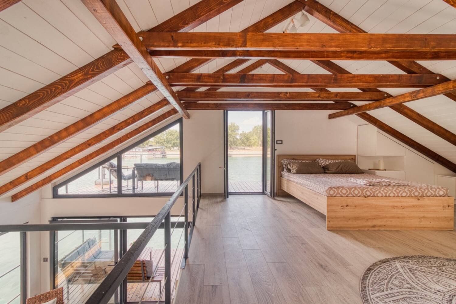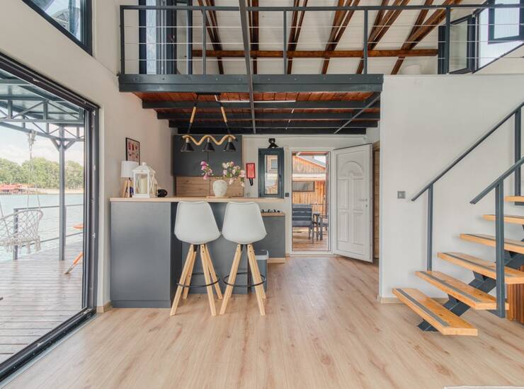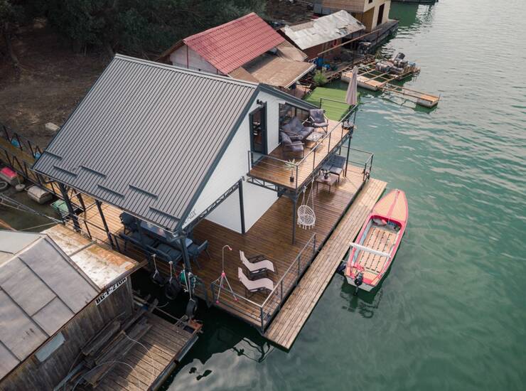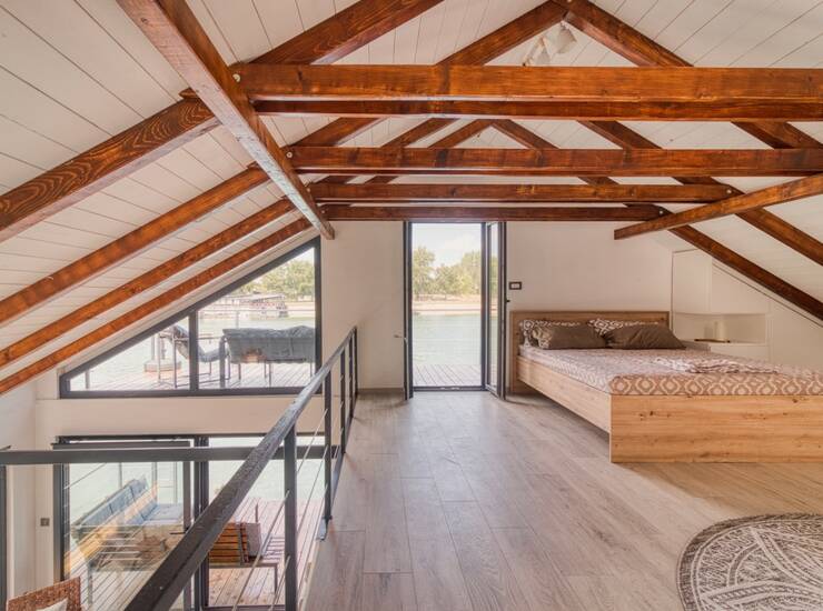 * Dimenzije splava su 9.6x9.1m sa kucicom koja je u osnovi 5.5m x 5.5m, sa galerijom povrsine 30m2.