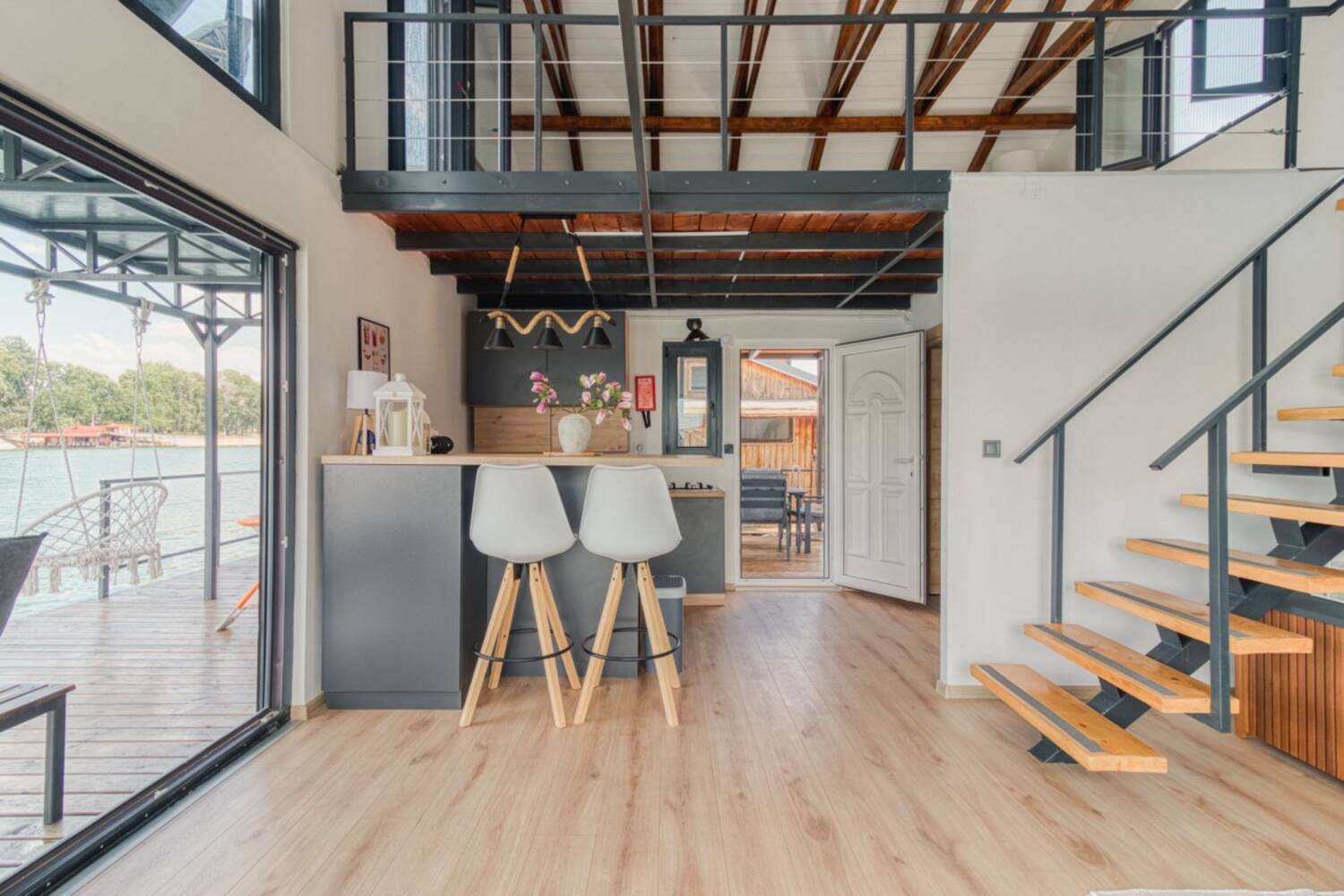 * Splav ima dve terase i ogradjeni balkon na koji se dolazi sa sprata.