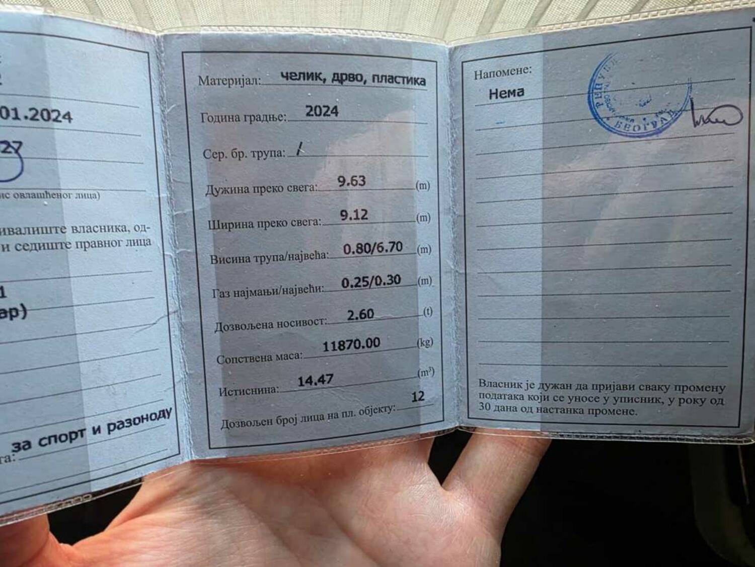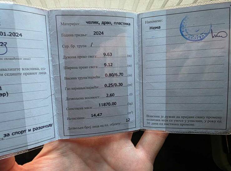 * Splav je izradjen po svim propisima kapetanije. Poseduje i plutajucu dozvolu koja se vidi na slikama.