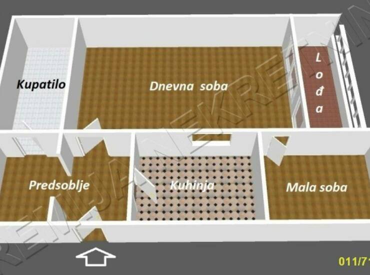Prostorije: hodnik, kuhinjsko-trpezarijski deo, kupatilo, dnevna soba, lođa.