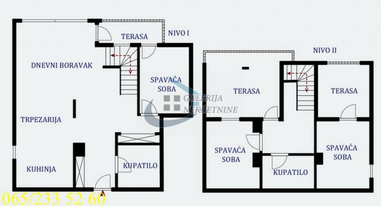 II nivo: dve spavaće sobe, kupatilo, dve terase.