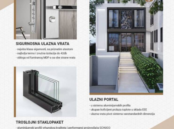 Posebno ističemo: zatvoreni stambeni objekat sa kontrolisanim pristupom ulaska, 24h fizičko obezbeđenje objekta, sistem grejanja i hlađenja toplotnom pumpom, prostrani lobby prostor sa izdvojenim delom za sedenje i pultom za portira, savremene drvene podne obloge vanstardanog formata, termotrtirane, premium kvaliteta, Italijanska granitna keramika prve klase u kombinaciji sa prirodnim mermeromu zonama kupatila i kuhinje, sigurnosna ulazna vrata visoke kategorije - najbolja termo i zvučna izolacija do 42db, fasada objekta od prirodnog brušenog kamena.