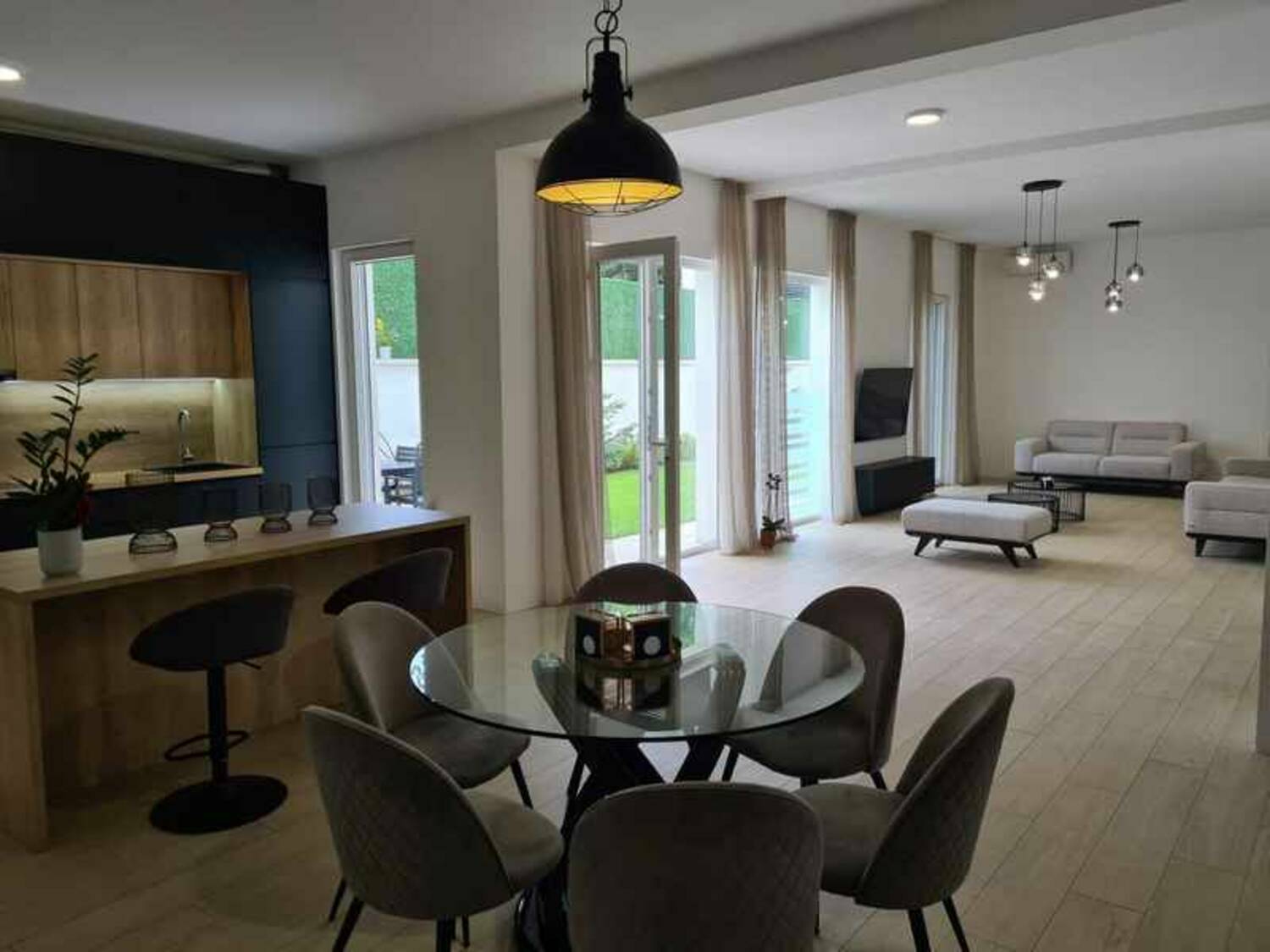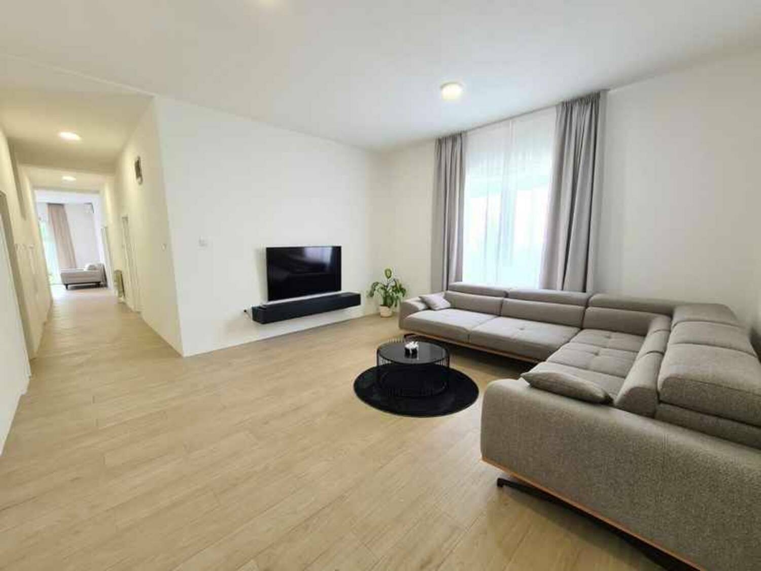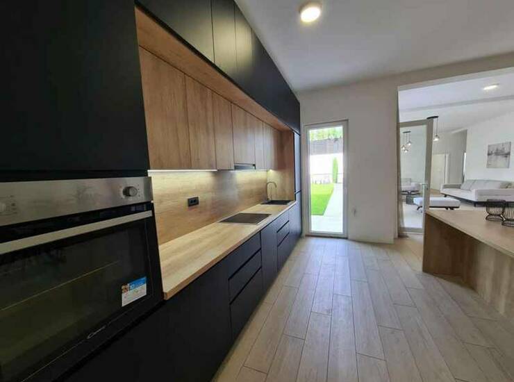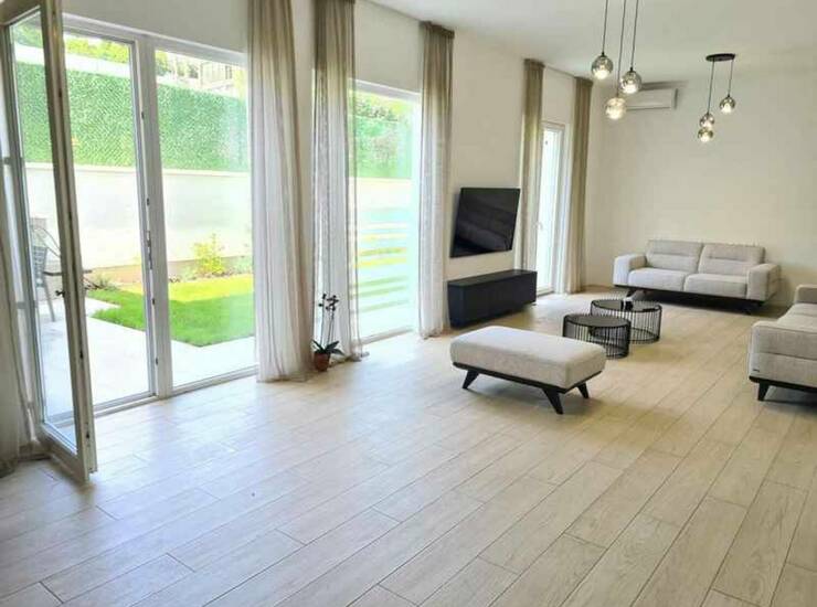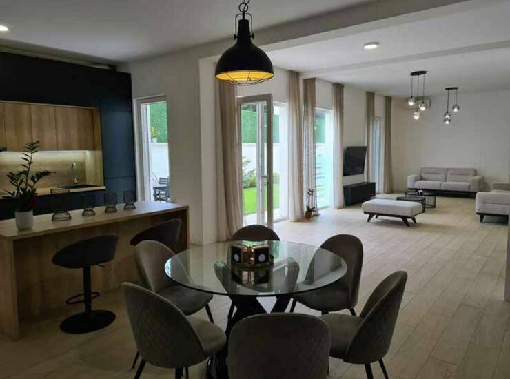 Prostorije: hodnik, dnevni boravak sa kuhinjom i trpezarijom, pet spavaćih soba, dva kupatila i dvorište. Stanu pripadaju dva garažna mesta.