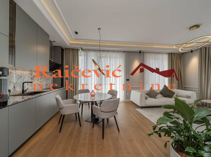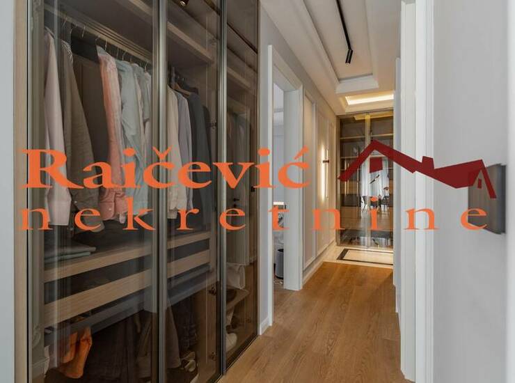 Luksuzan 2.0 komforan stan modernog enterijera sa velikim staklenim povrsinama. Dvostrano je orijentisan, svetao, sa terasom koja okruzuje ceo stan. Visina plafona 3 m, viseslojni hrastov parket sertifikovan za podno grejanje sa digitalnom kontrolom temperature u svakoj prostoriji, granitna keramika i sanitarije I klase, spoljna stolarija drvo-aluminijum sa troslojnim staklom i aluminijumskim zaluzinama na motorni pogon. Ventilacija svih prostorija preko centralnog necujnog sistema.