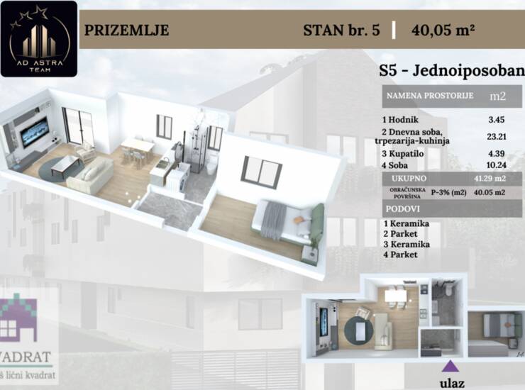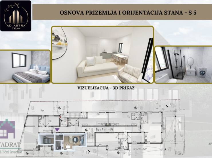 Na prodaju jednoiposoban stan površine 40 m² u prizemlju stambene zgrade u izgradnji. Stan se sastoji od ulaznog hodnika, dnevne prostorije sa kuhinjom i trpezarijom, spavaće sobe, kupatila i terase.