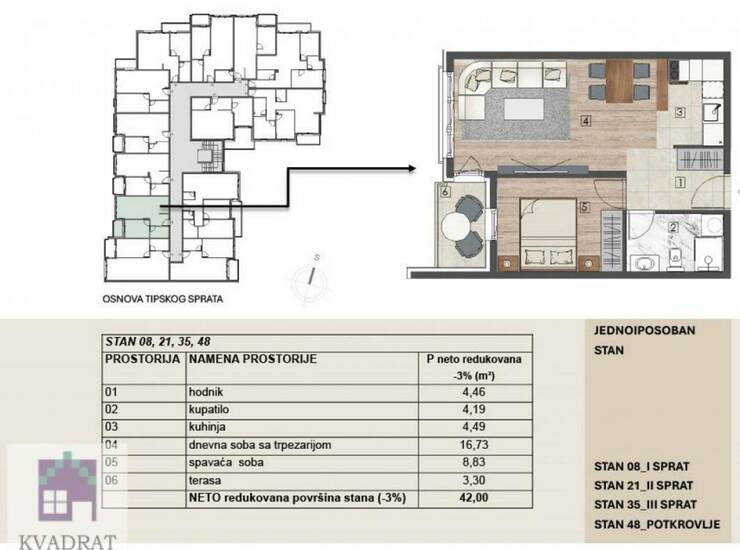 Na prodaju jednoiposoban stan površine 42m² u kvalitetnoj novogradnji. Stanovi su dostupni od prvog sprata do potkrovlja, sa funkcionalnim rasporedom koji pruža maksimalnu udobnost za život.