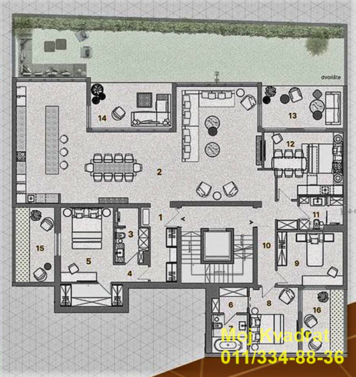 Ovaj stan gratis dobija i uređenu terasu sa zelenilom u dvorištu, površine 61,20m2.