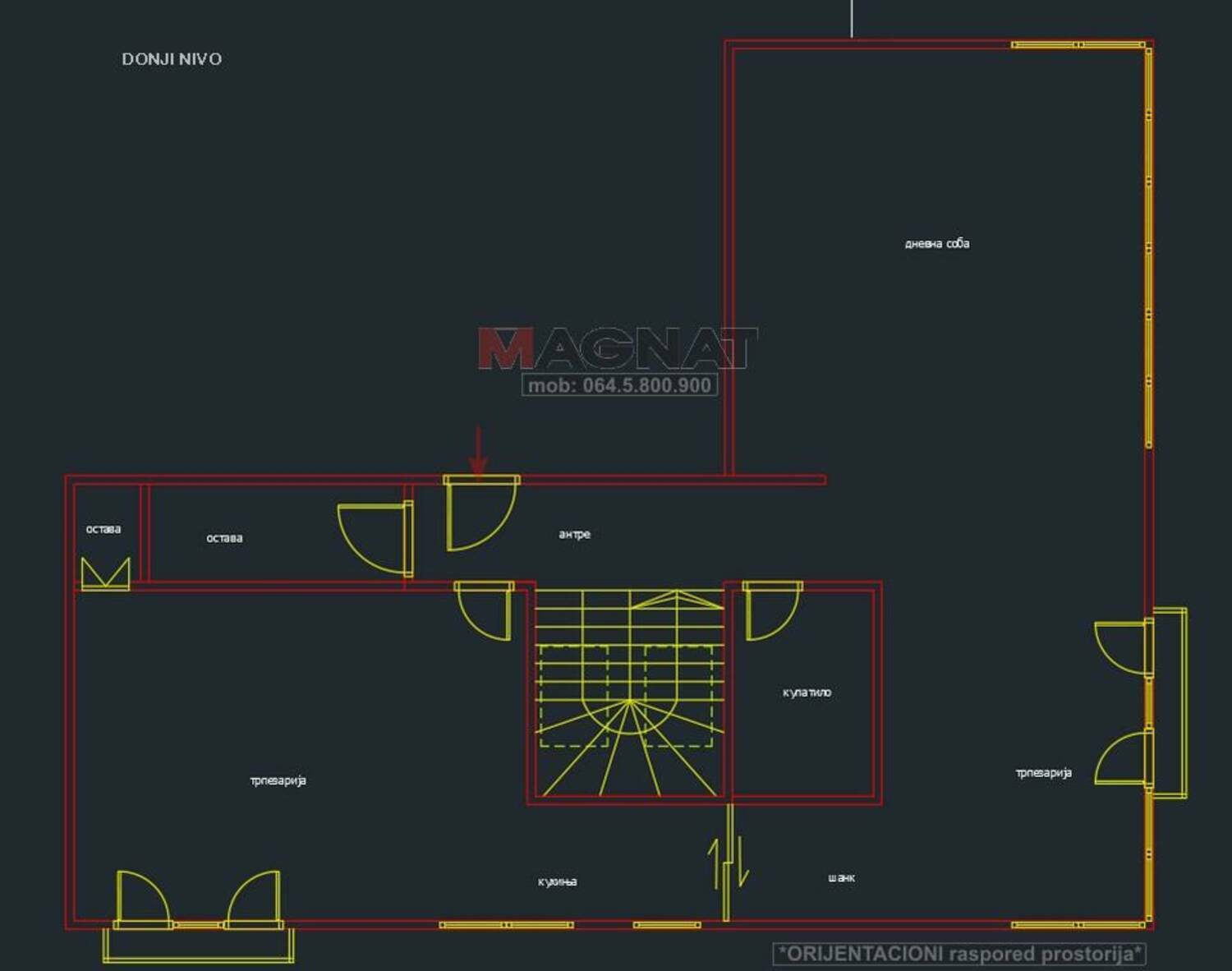 Prostorije: donji nivo (107m2): antre-hodnik, ostava, gostinski wc (sa tuš kabinom), kuhinja sa pomoćnom trpezarijom i mini terasom, šank/bar, velika trpezarija, prostrani dnevni boravak (sa staklenim kaminom i francuski balkonom) +