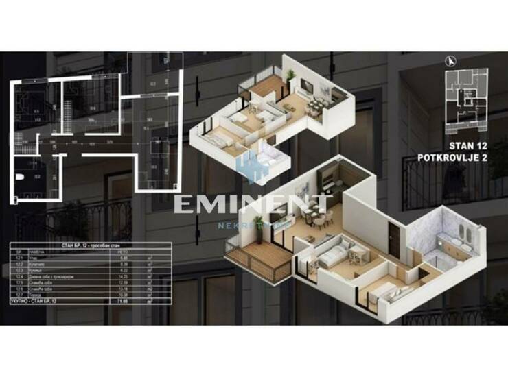 U ponudi je veoma funkcionalan stan sa terasom površine 10m2. Čine ga dnevni boravak sa trpezarijom i kuhinjom, dve spavaće sobe i kupatilo.