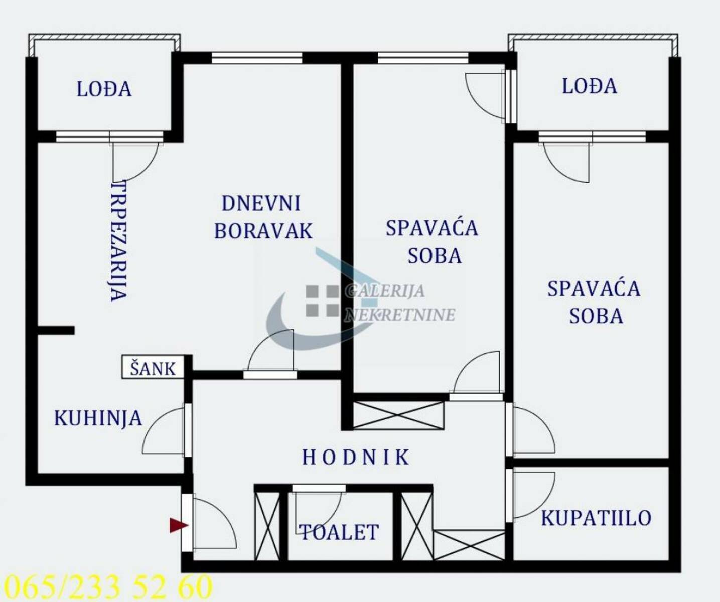 Od prostorija: hodnik, dnevno-trpezarijsko-kuhinjski deo, dve spavaće sobe, kupatilo, toalet, dve lođe.