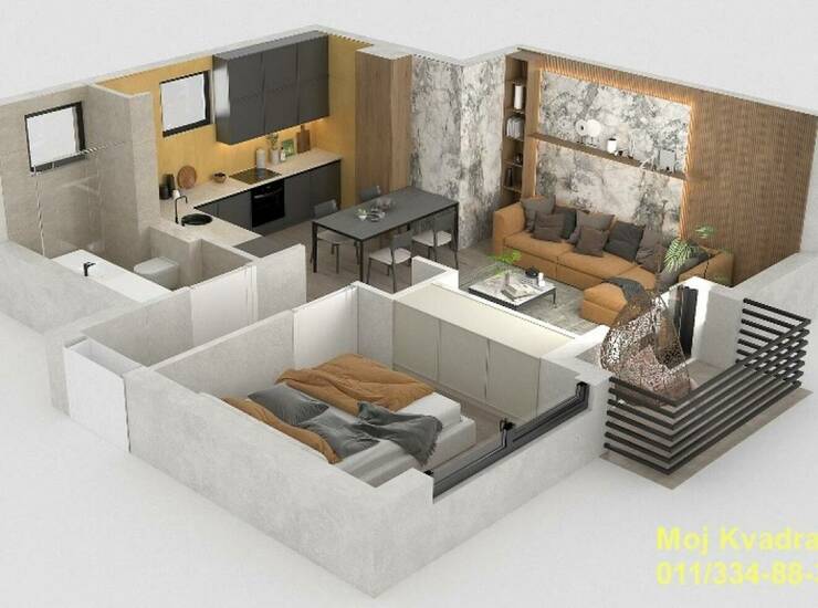 Prostorije: hodnik, dnevni boravak sa kuhinjom i trpezarijom, spavaća soba, kupatilo i terasa.