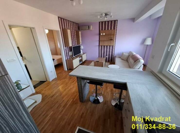 Prostorije: dnevna soba, kuhinja sa šankom, spavaća soba sa francuskim ležajem, kupatilo, hodnik, terasa.