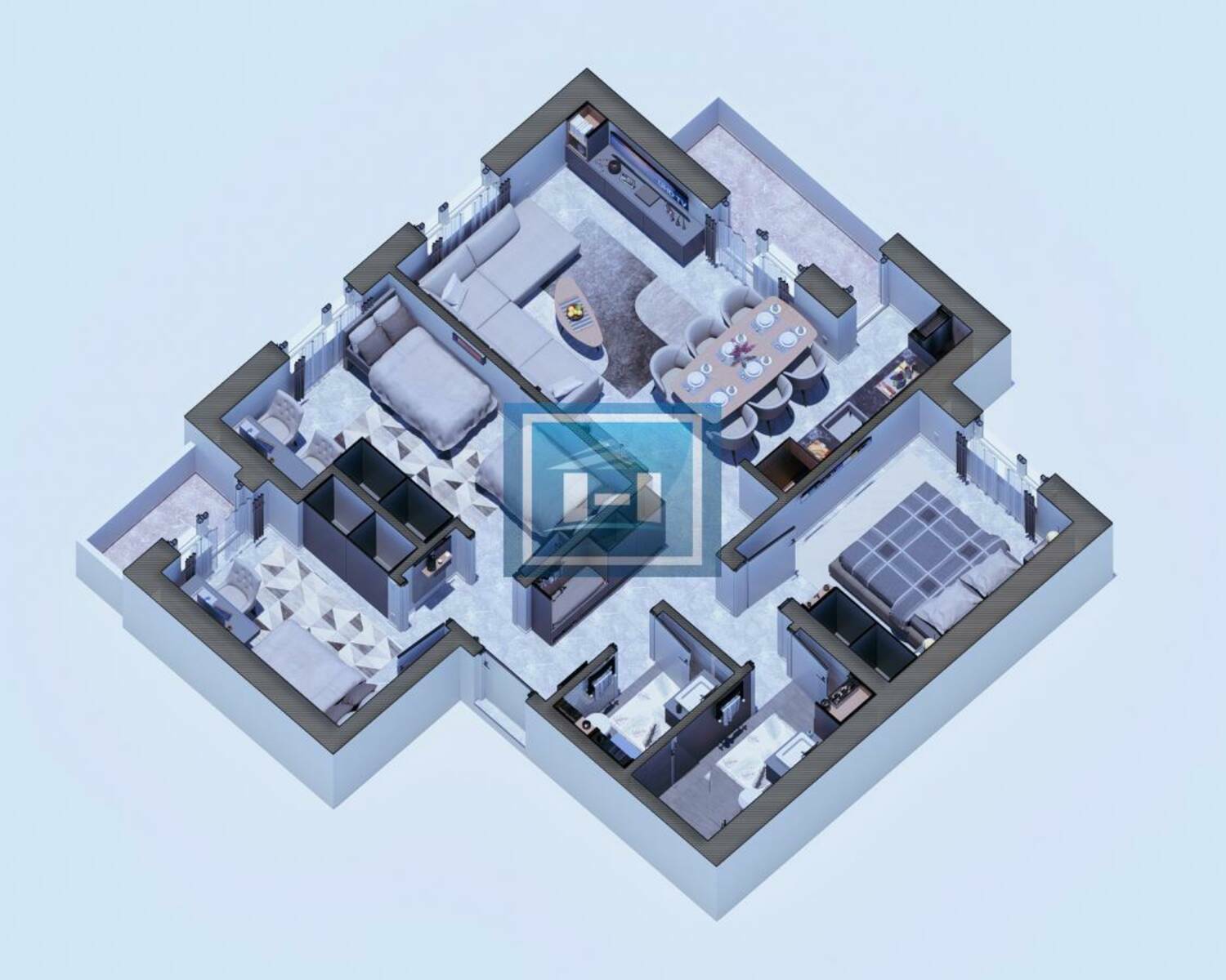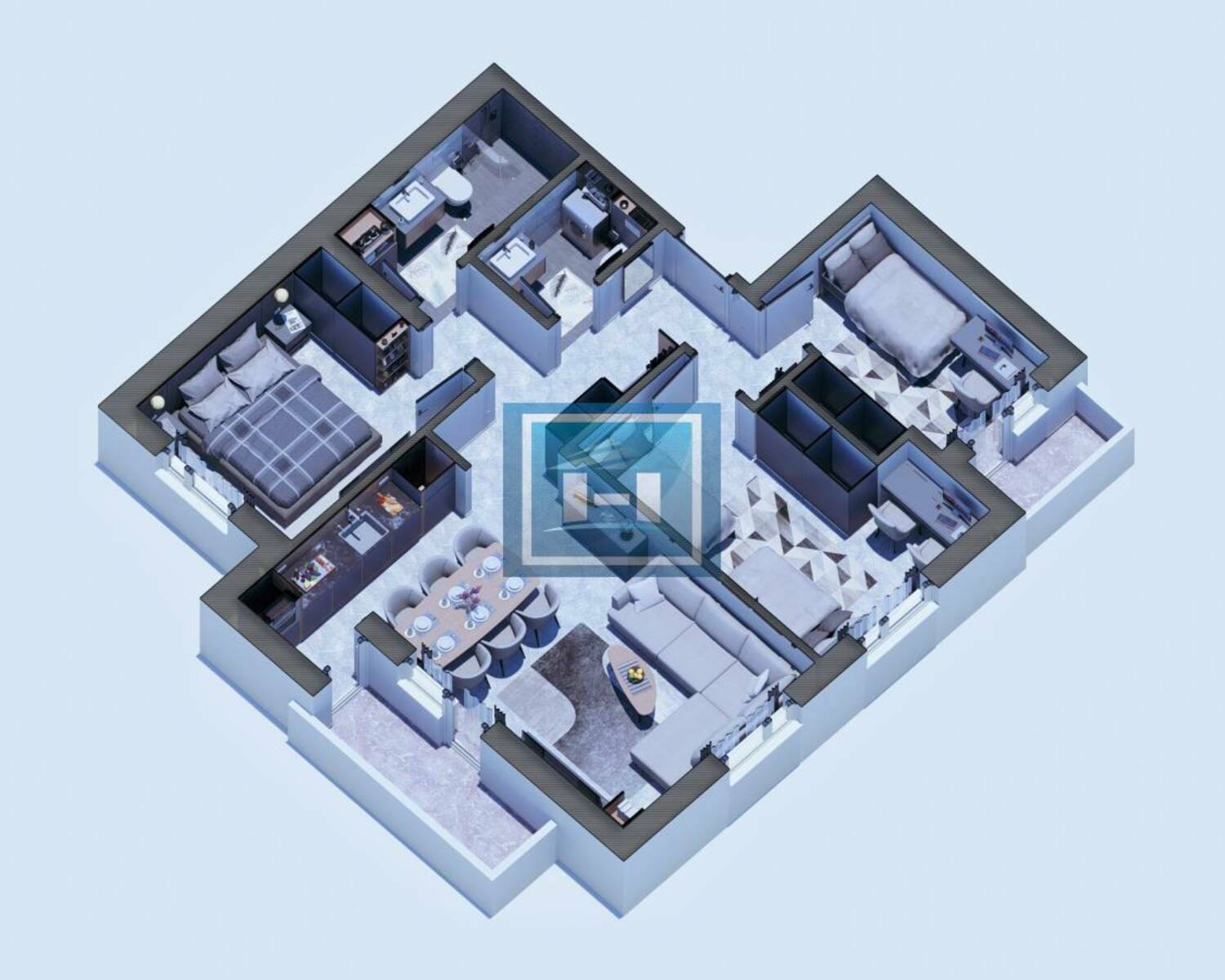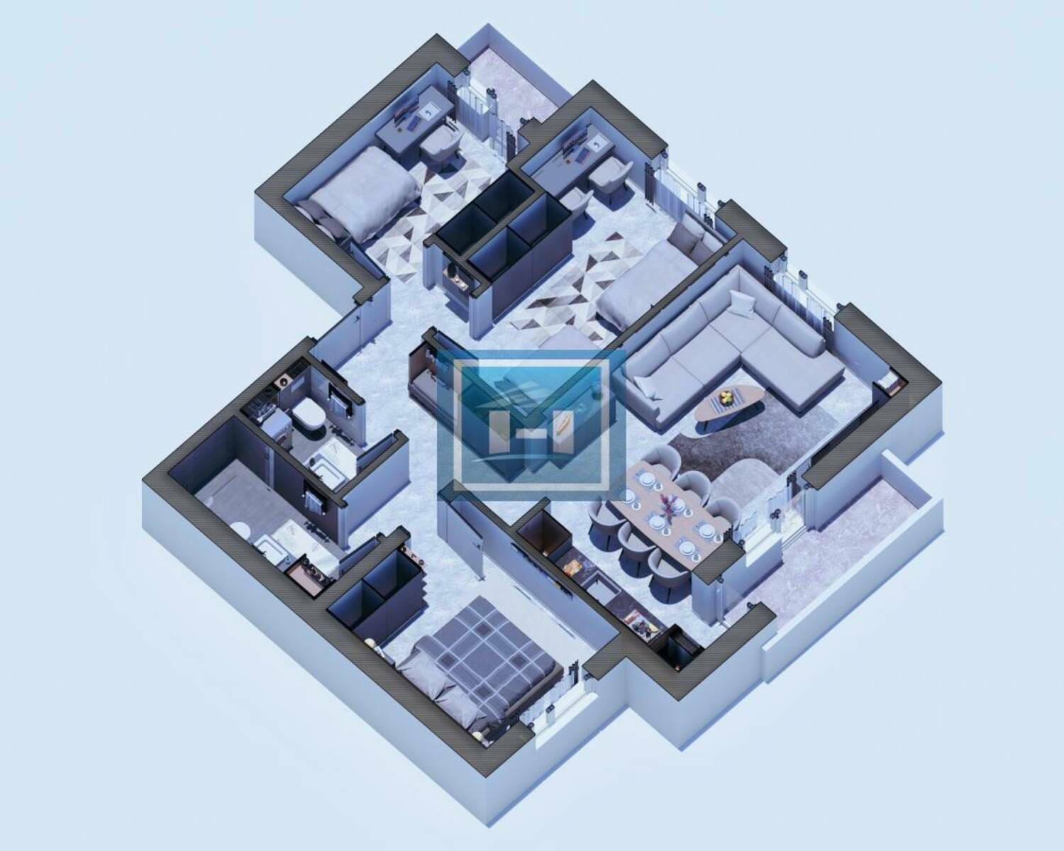 Stan raspolaže praktičnim ulaznim hodnikom koji vodi ka prostranom dnevnom boravku povezanom sa kuhinjom i trpezarijom u otvorenom konceptu. Noćna zona obuhvata dve komforne spavaće sobe, dok su odvojeni toalet i moderno kupatilo dodatna pogodnost za svakodnevni život. Terasa doprinosi dodatnom komforu i obilju prirodne svetlosti.