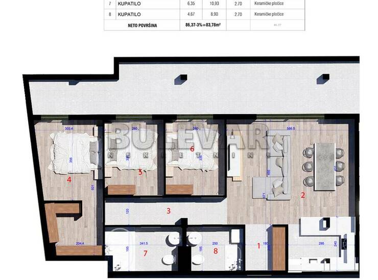 Na prodaju stan površine 83,78 m2, u izgradnji u Kragujevcu, u naselju Aerodrom, u blizini marketa, stadiona, škole, vrtića, pijace, autobuskog stajališta. Penthaus, koji uz hodnik ima i dnevni boravak sa trpezarijom, tri spavaće sobe, dva kupatila, i naravno terasu površine 31,2 m2. Objekat se gradi u skladu sa visokim energetskim standardima, zida termoblokom plus izolacija. Stolarija je od šestokomornih profila sa troslonjim staklom punjenim argonom i aluminijumskim zastorom. Završna obrada je od keramičkih pločica prve klase i tarketa. U stanu će biti postavljen inverter klima uredjaj. Grejanje na gas. Postoji mogućnost kupovine i garažnog mesta (10.000,00 eura plus PDV) ili parking mesta (5.000,00 eura plus PDV), koje nije uračunato u cenu. Zgrada je spratnosti Pr+3S+Po, na kome je i smešten ovaj stan. Planirani završetak radova na zgradi je polovina 2027.godine. Kupuje se direktno od investitora i postoji mogućnost povratka PDV-a, ako kupac ispunjava uslove za to. Za sve informacije i razgledanje stojimo vam na raspolaganju, radnim danima od 09-19h i subotom od 09-17h. Ovu i druge nekretnine sa većim brojem fotografija možete pogledati na našem sajtu: bulevarnekretnine.rs, kontakt: info@bulevarnekretnine.rs, usluga besplatna. Čekamo Vas. Telefon 034/330... Prikaži broj i 060/054... Prikaži broj . Bulevar Nekretnine 034, Kragujevac, broj u registru posrednika: 1278.