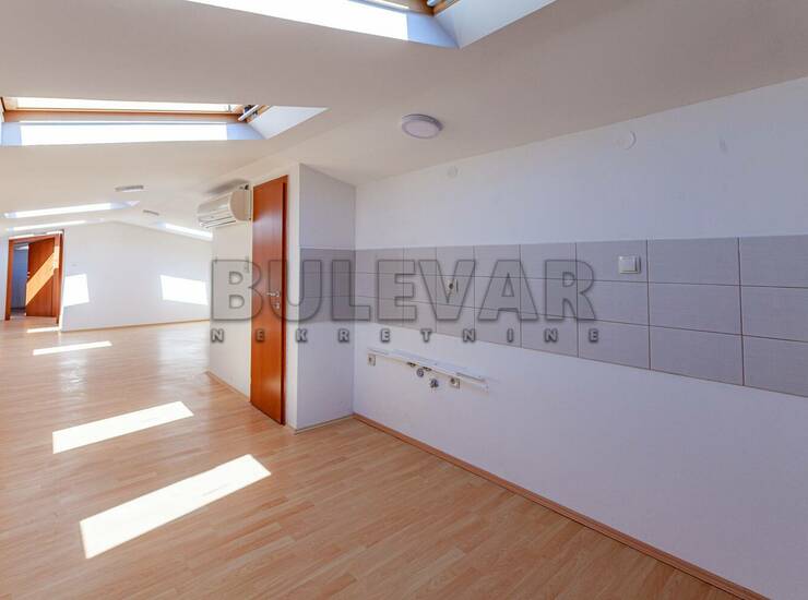 Na prodaju dvoiposoban stan, atelje, osmišljen kao lep poslovni prostor za kancelarije, biroe, agencije, predstavništva, a može biti i moderan stambeni prostor, na petom spratu novije zgrade sa liftom u centralnom delu grada. Sastoji se od ulaznog dela, kuhinjskog bloka, velike dnevne sobe kancelarije, iz koje se ulazi u kupatilo i dve manje sobe, kancelarije, od kojih jedna ima izlazak na terasu.Uknjižen kao privatna svojina, na pravno lice. Vredi videti i probuditi maštu poslovnih ljudi i enterijerista.