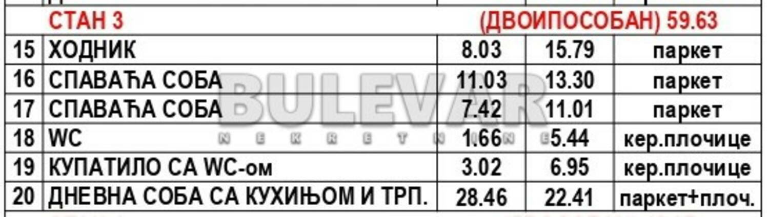 Stan je projektovane površine 59,63m2, nalazi se u prizemlju zgrade. Po strukturi je doiposoban i sastoji se od ulaznog hodnika, dnevne sobe, trpezarije, kuhinje, dve spavaće sobe, kupatila, zasebnog sanitarnog čvora.