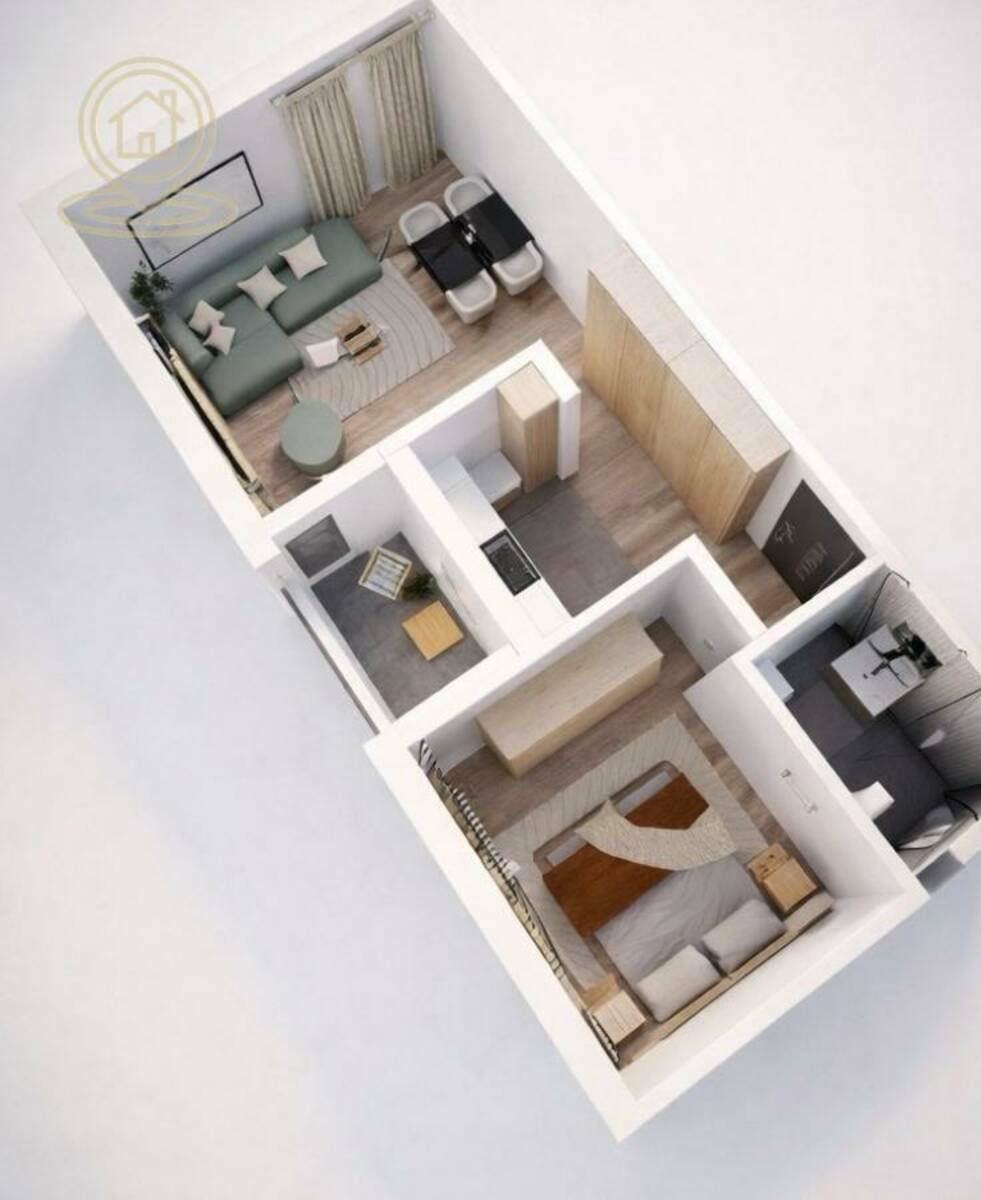 Stan se sastoji od hodnika, odvojene spavaće sobe, kupatila, kuhinje i prostranog dnevnog boravka sa trpezarijom i izlazom na lođu. Raspored prostorija je odlično organizovan, sa maksimalno iskorišćenim prostorom i puno prirodne svetlosti.