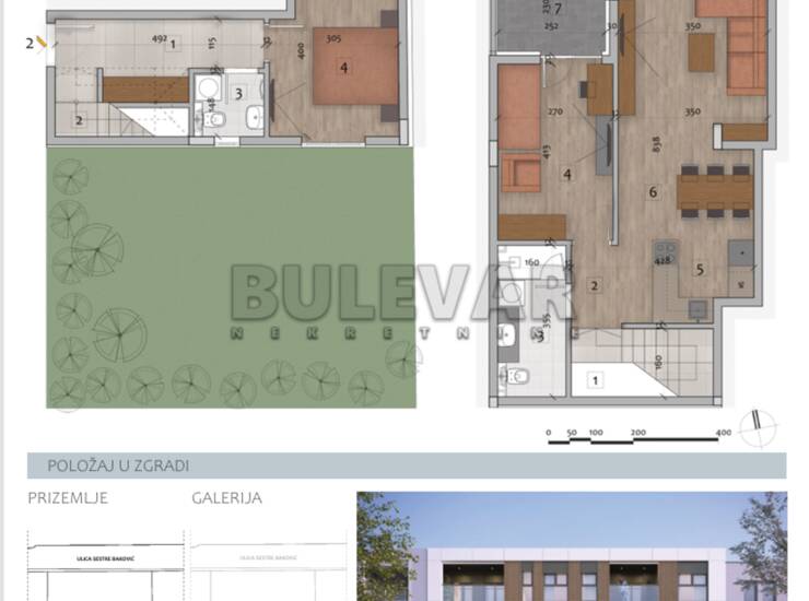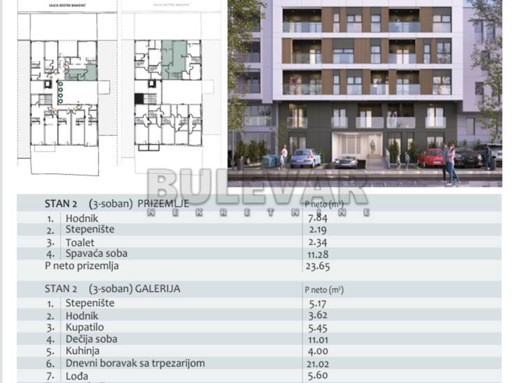 Na prodaju trosoban stan u prizemlju zgrade , sa galerijom, u izgradnji u Čairu, na atraktivnoj, mirnoj i prestižnoj lokaciji. Izgradnja zgrade je po najsavremenijim standardima moderne gradnje, Po +Pr+G+3 gde će ceo lobi prostor biti u oblogama i enterijerski urađen a prednja strana fasade ventilisana od Swiss pearl ploča, sa video nadzorom i video interfonom. Stan se sastoji od ulaznog hodnika, spavaće sobe i toaleta u prizemlju, i dnevne sobe sa trpezarijom, kuhinje, spavaće sobe, kupatila i lođe na galeriji. Stan ima i pripadajući deo dvorišta - bašte (oko 20-ak m2). Na podovima je troslojni parket velikog formata sa visokim lajsnama, keramika velikog formata, ugrađen smart tanki bojler, u dnevnoj sobi inverter klima a grejanje centralno, sa kalorimetrima. Spoljašna stolarija je aluminijum - drvo sa tri stakla i punjena argonom, sa termoizolacionim roletnama na elektro pogon. Planirani završetak radova najkasnije 15.08.2027. Mogućnost kupovine garažnih parking mesta i povraćaja PDV -a za kupce prvog stana. Za više informacija pozovite agenciju.
