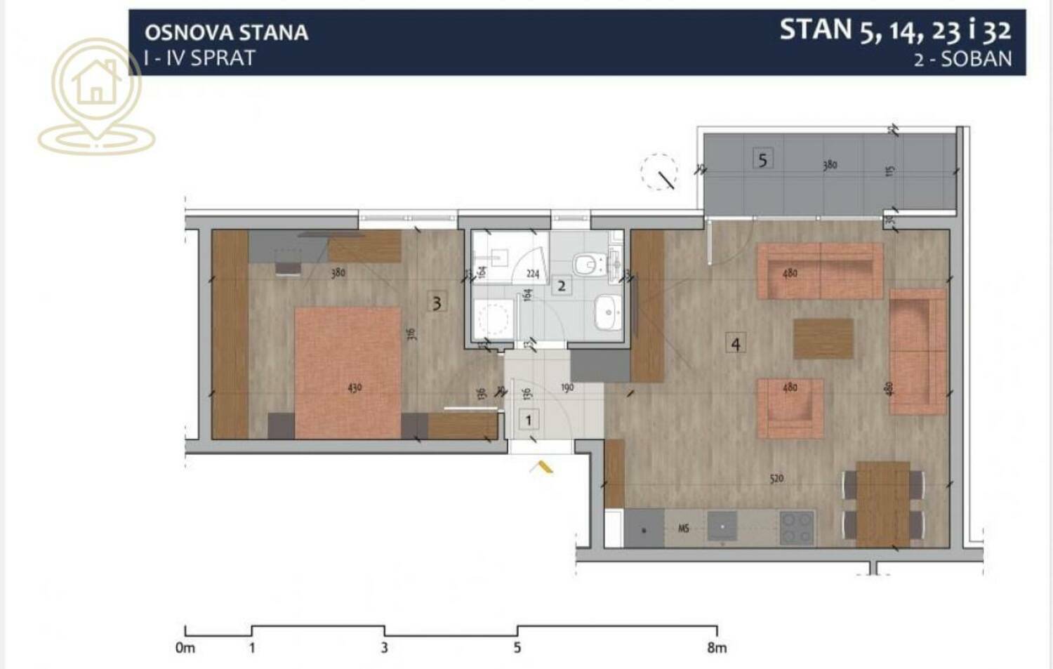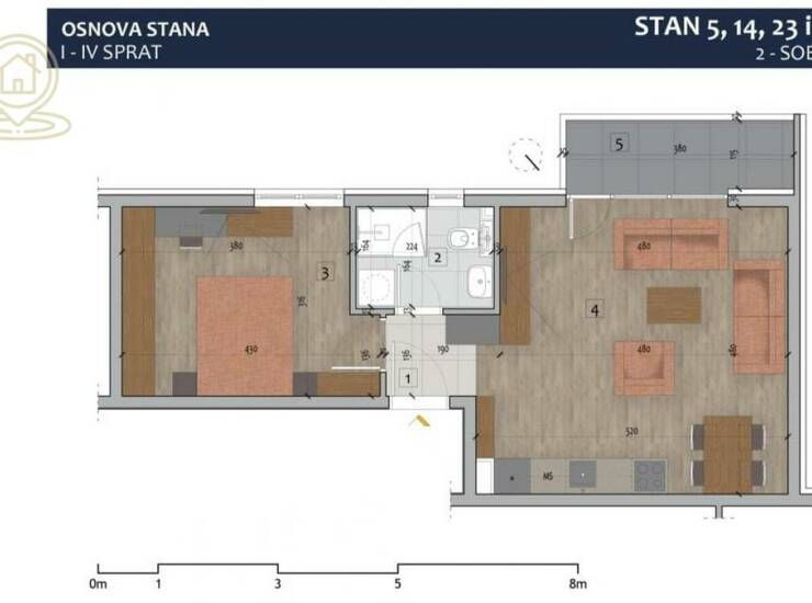 Podne obloge: Kronospan Tarkett 14 mm u sobama, granitna keramika u kuhinji, kupatilu i hodniku