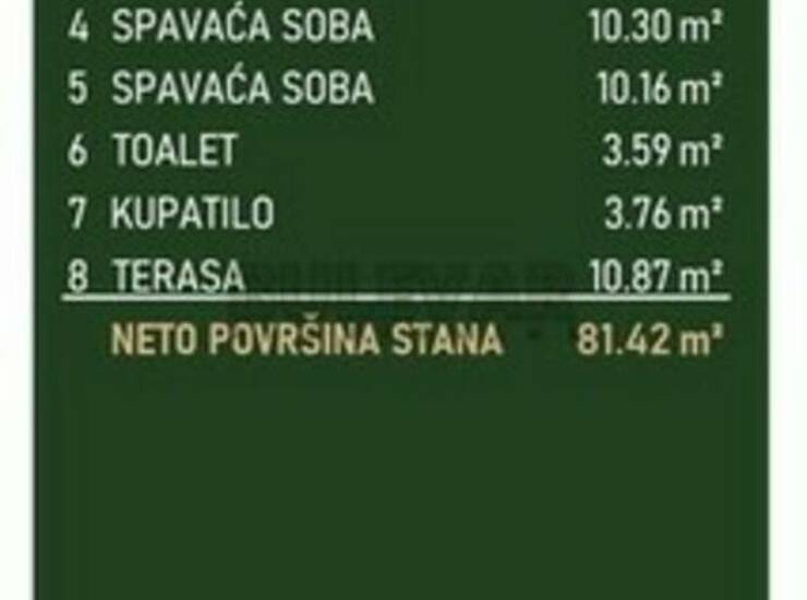 Struktura: ulazni hodnik dnevni boravak sa kuhinjom i trpezarijom tri spavaće sobe toalet kupatilo terasa Kvadrature i dostupnost: