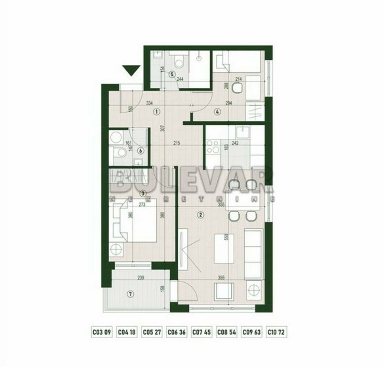 Lamela C - neto 56,27m² U ponudi 8 stanova od III do X sprata. Cena: III sprat - 2.139,76 €/m² X sprat - 2.310,31 €/m²