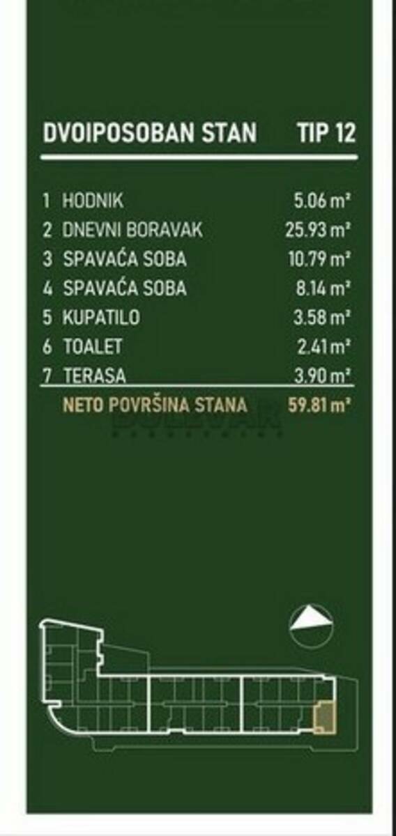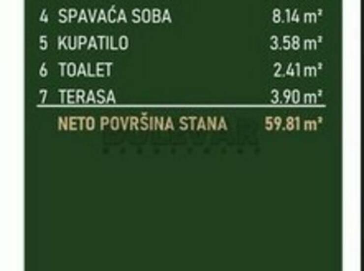 Struktura: ulazni hodnik dnevni boravak sa kuhinjom i trpezarijom dve spavaće sobe toalet kupatilo terasa Kvadrature i dostupnost: