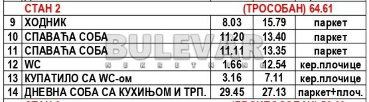 Stan je projektovane površine 64,61m2, nalazi se u prizemlju zgrade. Po strukturi je trosoban i sastoji se od ulaznog hodnika, dnevne sobe, trpezarije, kuhinje, dve spavaće sobe, kupatila, zasebnog sanitarnog čvora.