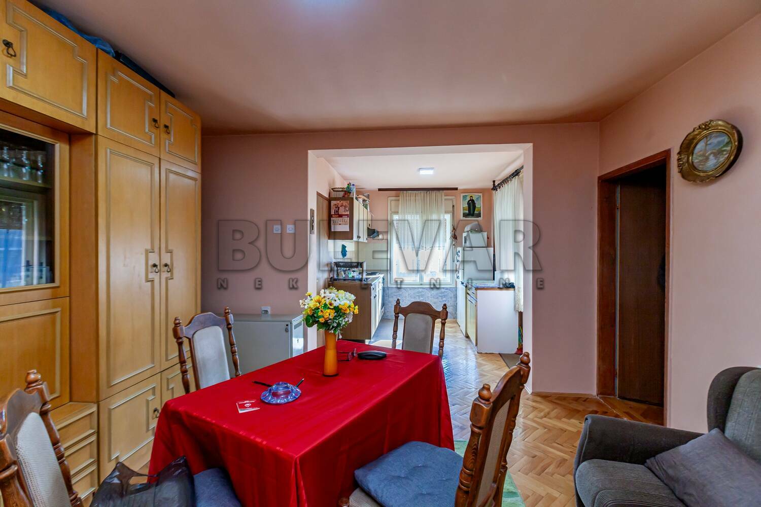 Stan se nalazi na prvom spratu kuće. Drvena stolarija, parket, keramičke pločice...