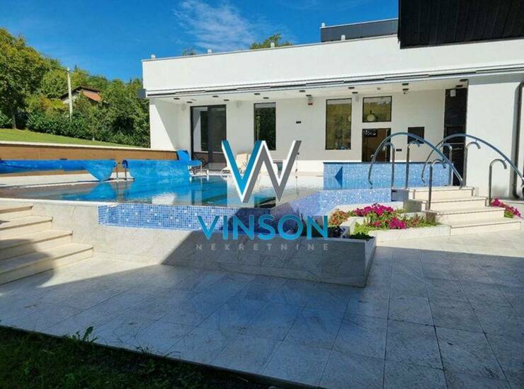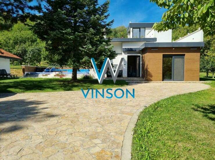 Sremski Karlovci - Zanoš. Izdvajamo iz ponude ekskluzivnu, novu porodičnu kuću visokog kvaliteta gradnje sa pomoćnim stambenim objektom za odmor. Nalazi se na lepoj i mirnoj lokaciji za stanovanje. Izolovana od gradske gužve i buke. Na placu ukupne površine 5.888 m2, izgrađena je prizemna kuća 126m2 i pomoćni objekat 100m2. Kuća je po strukturi trosobna i čine je dnevni boravak sa trpezarijom, kuhinja sa ostavom, dve spavaće sobe i kupatilo sa tuš kabinom. Pomoćni stambeni objekat je spratnosti suteren i prizemlje (po projektu je moguće na spratu izgraditi dva stana). Trenutno se u prizemlju nalaze jedna soba, zatvoren bazen sa saunom i odvojen toalet, dok je na spratu trenutno velika krovna terasa. Prostrano i ozelenjeno dvorište, oivičeno voćnjakom i vinogradom. Poseduje manje veštačko jezero, letnjikovac sa zidanim roštiljem i otvoren bazen. Ugrađeni alarm, video nadzor na objektima i imanju. Ekološka septička jama, dva bunara, zalivni sistem. Useljiva po dogovoru. (Vinson nekretnine, Novi Sad, Reg. br. posrednika: 1085)