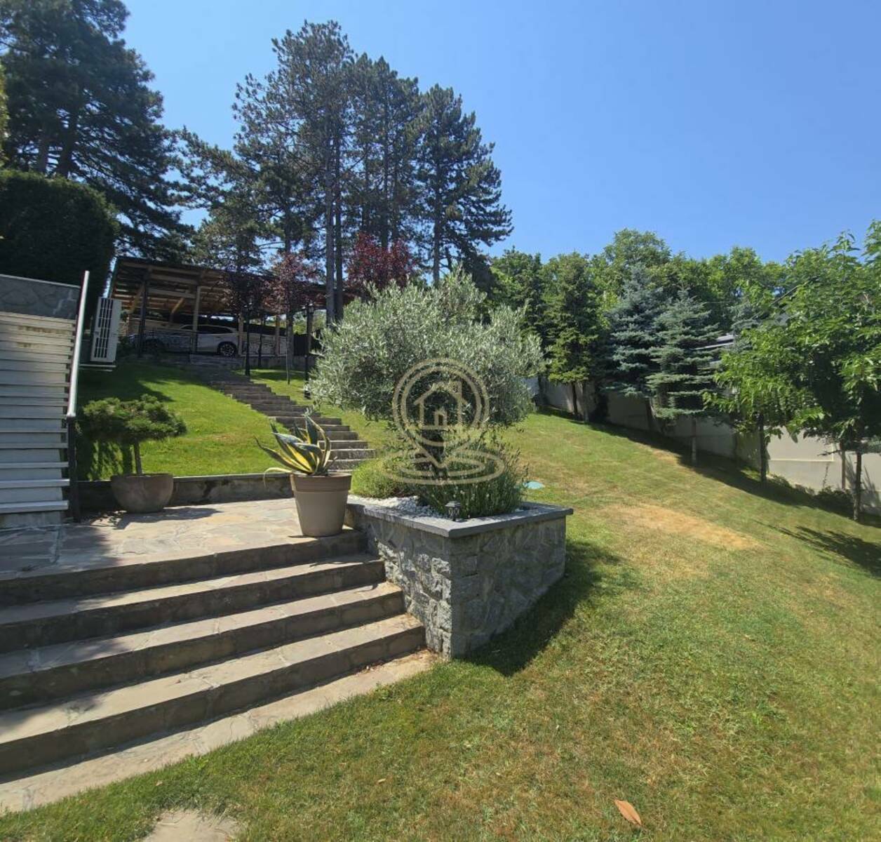 dvorište sa stoletnim borovima i bogatim zelenilom (palme, masline, lavanda, kamelije…)