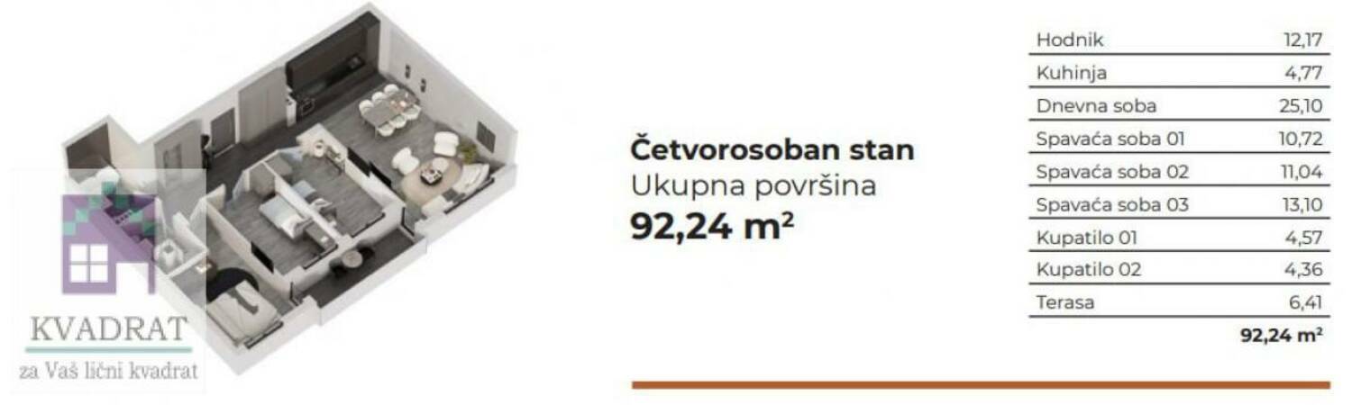 Stan 92.24m² se nalazi na prvom spratu i sastoji se iz hodnika, dnevne sobe sa kuhinjom i trpezarijom, 3 spavaće sobe, 2 kupatila i terase.