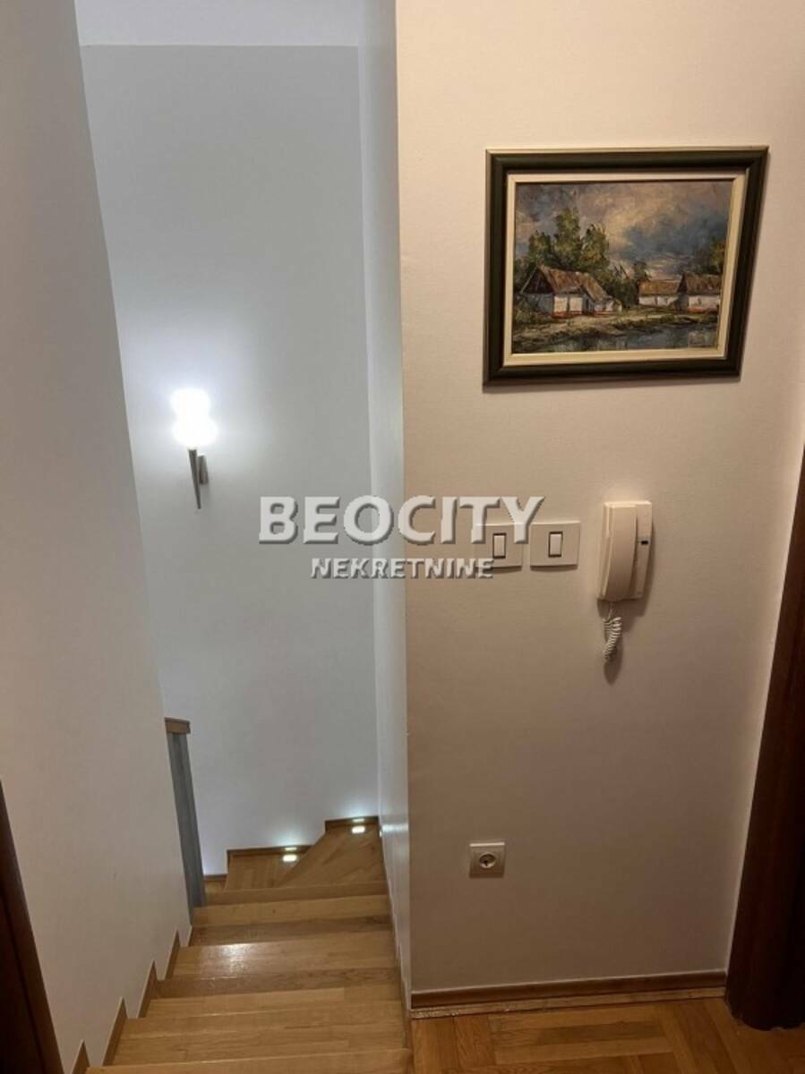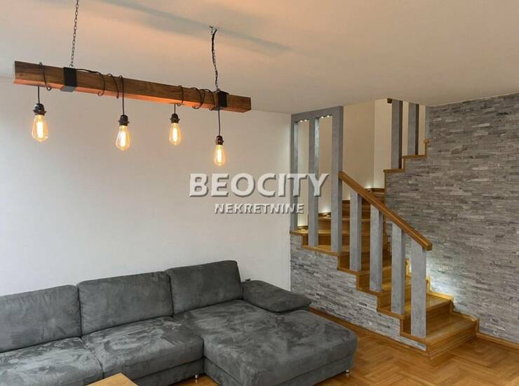 PRVI NIVO: Dnevna soba 28 m2, veliki hodnik, dizajnirana kuhinja i trpezarija, toalet i 2 terase. Stepeniste posebno lepo uredjeno vodi na DRUGI NIVO: 3 spavace sobe, kupatilo sa kosinama koje daju posebnu lepotu ovom stanu. Uknjizen. Zgrada je gradjena 2012 g odrzavana i veoma cista. Napomena: stan je na V spratu i do njega se dolazi izdvojenim liftom sa kljucem specijalnim za tu namenu. Na istom spratu postoji jos samo jedan takav stan.